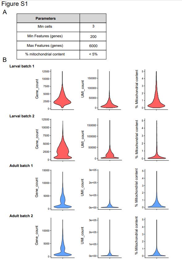 Fig. S1. Quality control (QC) metrics of Xenopus cornea scRNA-seq data. (A) Table showing the QC cutoffs applied on raw reads from scRNA-seq data prior to analysis. (B) Violin plots showing the distribution of gene counts, UMI counts and % mitochondrial content in larval and adult samples, after applying QC cutoffs. |