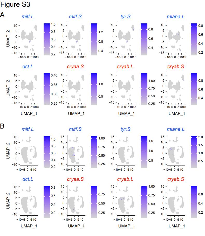 Fig. S3. The absence of skin and lens cell types in (A) larval and (B) adult frog cornea was verified based on the expression of marker genes. Feature plots of cell-type-specific marker genes. Skin cell marker genes (highlighted in blue): melanocyte inducing transcription factor (mitf.L and mitf.S), tyrosinase (tyr.S), melan-A (mlana.L), dopachrome tautomerase (dct.L). Lens cell marker genes (highlighted in red): crystallin alpha A (cryaa.S), crystallin alpha B (cryab.L and cryab.S). |