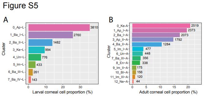 Cellular and molecular profiles of larval and adult Xenopus corneal epithelia resolved at the single-cell level.
