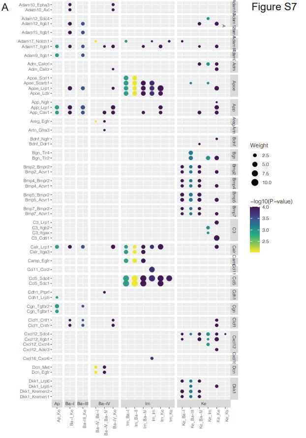 Fig. S7. Dot plot representing all outbound signals to different cell types in (A) larval and (B) adult frog corneas. Size of each dot signifies the weight of the corresponding ligand-receptor interactions, and the color indicates negative log10 P-value of the source-to-target interaction, as indicated in the keys. |