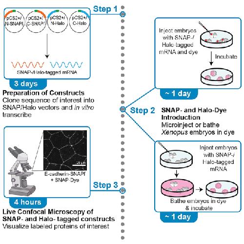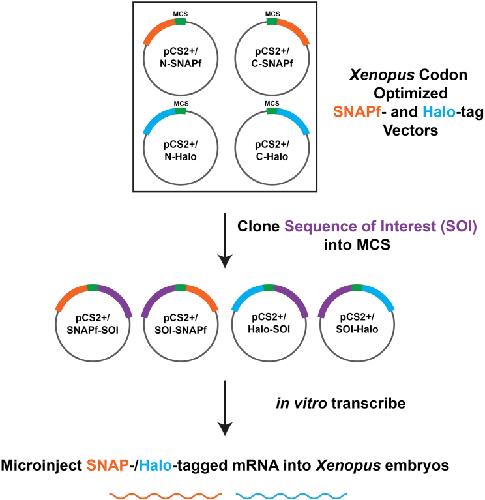 Figure 1. Workflow for expression of pCS2+/SNAPf- and Halo-tagged constructs in Xenopus embryospCS2+/SNAPf- and Halo-vectors that were codon optimized for Xenopus can be acquired from Addgene. The sequence of interest is cloned into the multiple cloning site (MCS), located upstream/downstream of the SNAPf/Halo-tag. Tagged constructs are in vitro transcribed to generate mRNA that is microinjected into 2–4 cell stage Xenopus embryos. |