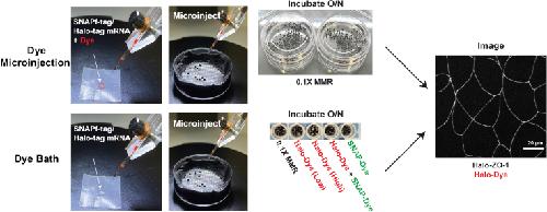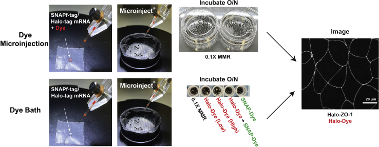 Figure 2. Dye introduction methods for labeling SNAPf- or Halo-tagged proteins expressed in intact Xenopus embryos(Top) SNAP/Halo dyes can be microinjected with SNAPf- or Halo-tagged mRNAs. (Bottom) After microinjecting SNAPf- or Halo-tagged mRNAs, embryos can also be bathed in SNAP/Halo dyes overnight (O/N, 15–22 h) for next-day imaging. |