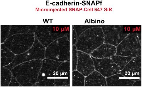 Figure 3. SNAP-tagged proteins can be visualized in both wild type (WT) and albino gastrula-stage Xenopus laevis embryosImages of WT (left) and Albino (right) Xenopus laevis embryos co-microinjected with E-cadherin-SNAPf mRNA (50 pg) and SNAP-Cell 647 SiR dye (10 μM). Scale Bars: 20 μm. |