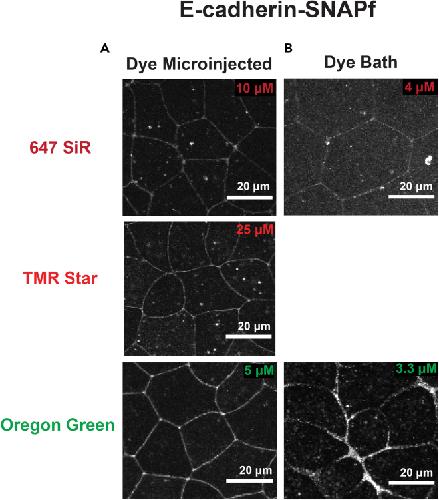 Figure 4. Microinjecting or bathing embryos in dye can label E-cadherin-SNAPf in vivo(A) Images of Xenopus embryos expressing E-cadherin-SNAPf (50 pg) labeled via dye microinjection with SNAP-Cell 647 SiR (10 μM), SNAP-Cell TMR Star (25 μM), or SNAP-Cell Oregon Green (5 μM).(B) Images of Xenopus embryos expressing E-cadherin-SNAPf (50 pg) labeled via dye bath with SNAP-Cell 647 SiR (4 μM) or SNAP-Cell Oregon Green (3.3 μM).Scale Bars: 20 μm. |