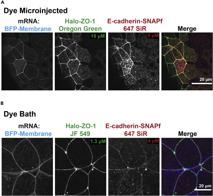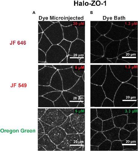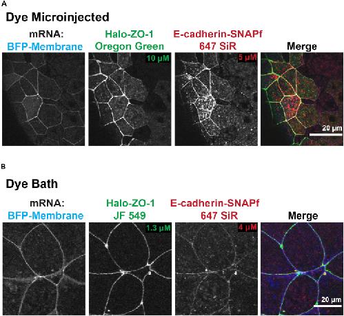 Figure 5. Microinjecting or bathing embryos in dye can label Halo-ZO-1 in vivo(A) Images of Xenopus embryos expressing Halo-ZO-1 (100 pg) labeled via dye microinjection with Janelia Fluor 646 HaloTag (20 μM), Janelia Fluor 549 HaloTag (5 μM), or Oregon Green HaloTag (5 μM).(B) Images of Xenopus embryos expressing Halo-ZO-1 (100 pg) labeled via dye bath with Janelia Fluor 646 HaloTag (1.3 μM), Janelia Fluor 549 HaloTag (1.3 μM), and Oregon Green HaloTag (3.3 μM).Scale Bars: 20 μm. |