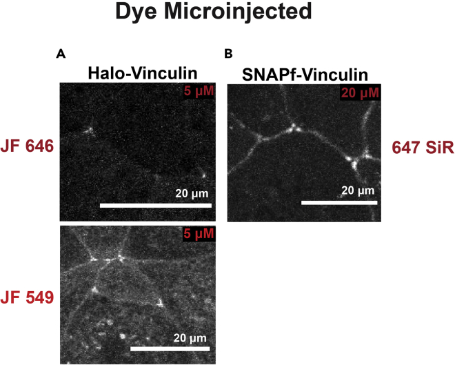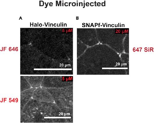 Figure 6. Microinjecting dye can label SNAPf-/Halo-Vinculin in vivo(A) Images of Xenopus embryos expressing Halo-Vinculin (10 pg) labeled via dye microinjection with Janelia Fluor 646 HaloTag (5 μM) and Janelia Fluor 549 HaloTag (5 μM).(B) Image of Xenopus embryo expressing SNAPf-Vinculin (10 pg) labeled via dye microinjection with SNAP-Cell 647 SiR (20 μM).Scale Bars: 20 μm. |