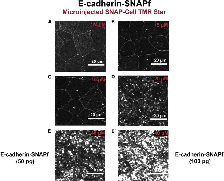 Figure 9. Dye and mRNA concentration optimization is necessary to reduce non-specific signal(A–E) Images of E-cadherin-SNAPf (50 pg) labeled with SNAP-Cell TMR Star ((A) 1.2 μM, (B) 5 μM, (C) 10 μM, (D) 20 μM, (E) 40 μM) through dye microinjections.(E′) E-cadherin-SNAPf (100 pg) labeled with 40 μM SNAP-Cell TMR Star.Scale Bars: 20 μm. |