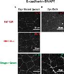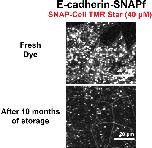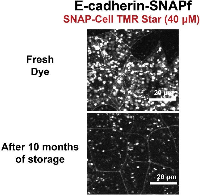 Figure 10. Non-desiccated SNAP-Cell TMR-Star dye aliquots can lose brightness following long-term storageE-cadherin-SNAPf (50 pg) labeled with SNAP-Cell TMR Star (40 M) (newly acquired, top) (long term storage, bottom). Scale Bars: 20 μm. |