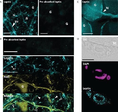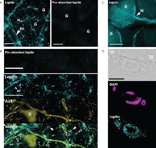 Figure 1. Leptin is expressed in nerves and blood vessels in the dorsal skin of Xenopus laevis juveniles. (A) Leptin protein is expressed in blood vessels (BV) and nerves (N) in the dermis and hypodermis. Only background fluorescence from granular glands (G) is present in tissue stained with antibody that was incubated with recombinant Xenopus leptin protein (4 μg) prior to staining (pre-absorbed). Scale bars, 100 µm. (B) Leptin is expressed in the endothelial cells of a large blood vessel (BV) in the hypodermis and unknown scattered cell bodies (solid arrows). Leptin also co-localizes with acetylated alpha-tubulin (AαT, yellow), a neural marker in axons and some nerve cell bodies (hollow arrows). Granular glands are autofluorescent after bleaching and clearing at 488 nm (as seen in the AαT panel). Scale bars, 100 µm. (C) Leptin protein co-localizes with axons innervating a granular gland. (D) Cross section showing leptin in the endothelial cells of a blood vessel in the hypodermis, up against the stratum corneum (SC) of the dermis. Scale bar, 25 µm. |