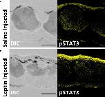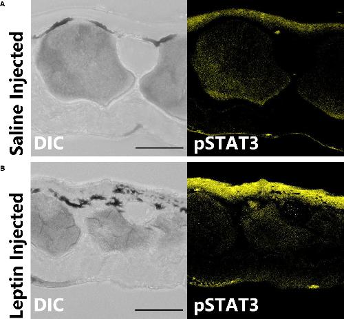 Figure 2. Leptin stimulates JAK/STAT signaling in skin. Leptin-induced phosphorylated STAT3-ir (pSTAT3-ir, yellow) in 16-µm sections of juvenile Xenopus laevis dorsal skin; skin was fixed 6 h after intraperitoneal injection with (A) saline or (B) leptin. Leptin stimulates pSTAT3-ir strongly in the epidermis and at the apical end of the granular glands and hypodermis (representative image from n = 3). Scale bar, 100 µm (n = 3). Epidermis (E), dermis (D), stratum corneum of the dermis (SC), and thin hypodermis (H). Scale bar, 50 µm. |