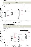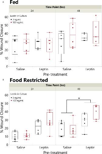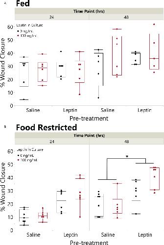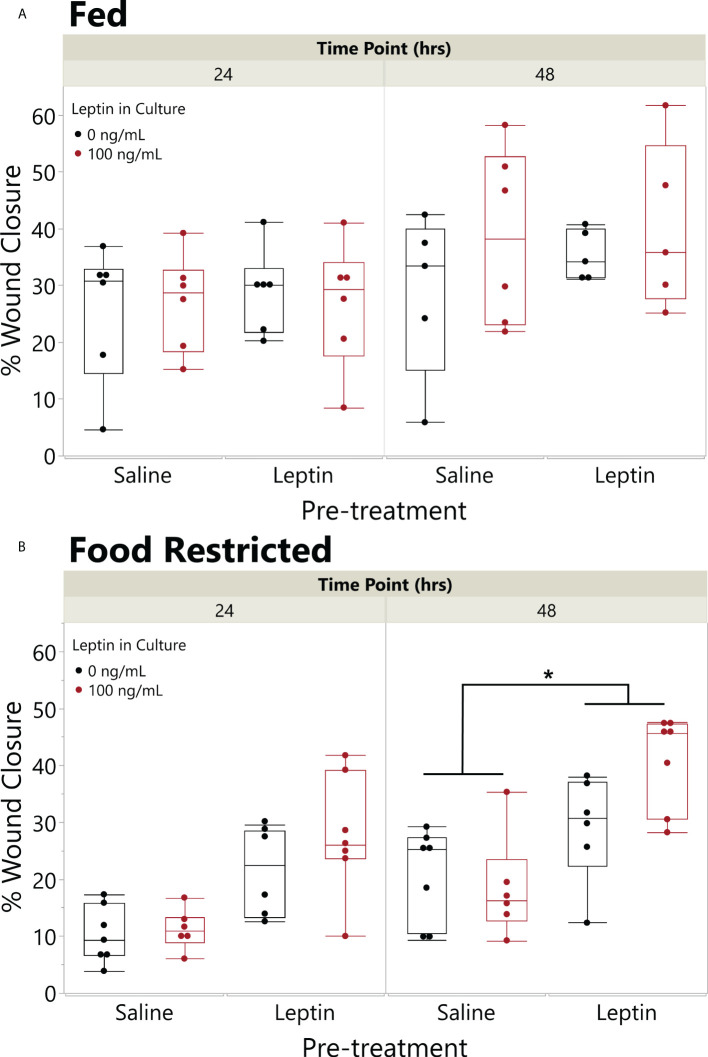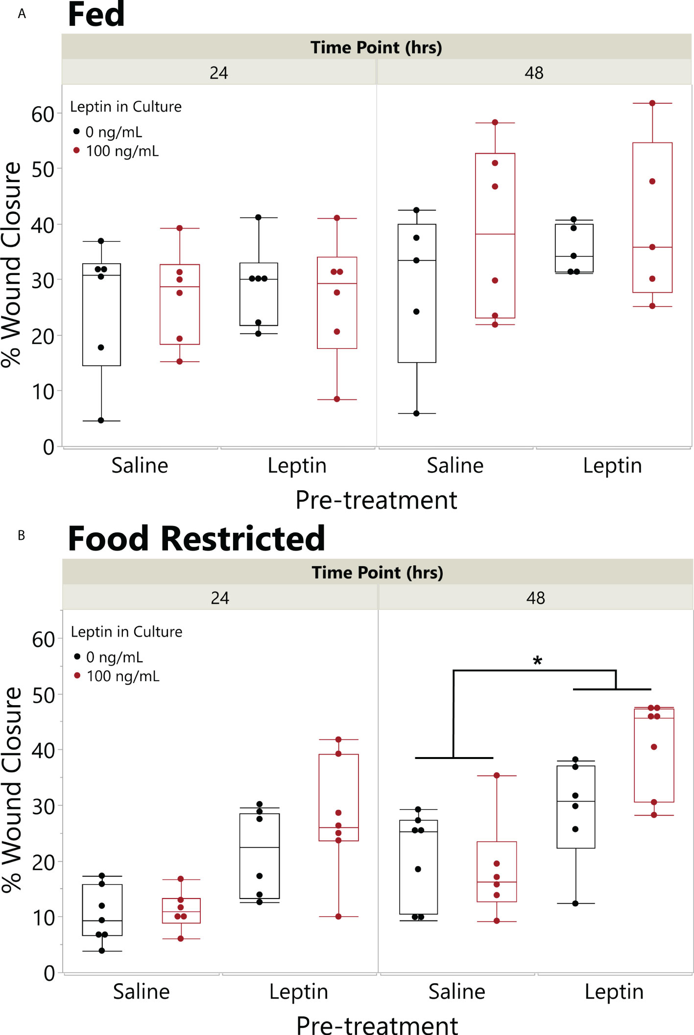 Figure 6. Pretreatment with leptin rescues effect of food restriction on wound closure in vitro. Effect of leptin on in vitro wound healing of juvenile Xenopus laevis dorsal skin explants where animals were fed (A) once a day or (B) food restricted for 31 days and then injected in the peritoneum (IP) with leptin (200 ng/g body weight) or saline every other day for 7 days. Dorsal skin donut explant wounds were then treated with (black) or without leptin (red) in culture (100 ng/ml) for 48 h. Pretreatment with IP leptin injection significantly increased the rate of wound closure in food-restricted animals over those with pretreatment injections of saline by 48 h, but there was no effect of pretreatment injection in fed animals (ANOVA, fed status * injection, p = 0.0253); asterisk indicates significant increase in wound healing in leptin pretreated vs. saline pretreated explants (Tukey’s HSD, p < 0.05, n = 8/treatment). There was no significant effect of leptin in the culture media (black vs. red) in this model (p = 0.1809). |
