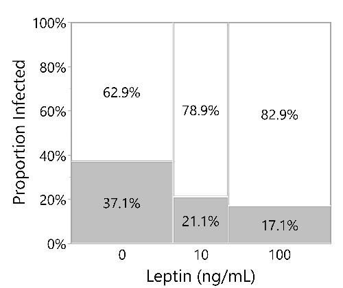 Figure 7. Leptin suppresses microbial growth in culture media of skin explants. Proportion of culture wells visually turbid with bacterial infection for juvenile Xenopus laevis dorsal skin wound explant cultured in increasing leptin concentration at 48 hpi. Increasing leptin concentration (0 ng/ml, n = 70; 10 ng/ml, n = 38; 100 ng/ml, n = 70) significantly decreased the number of infected wells (likelihood ratio test, p = 0.0202). |