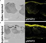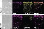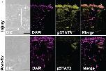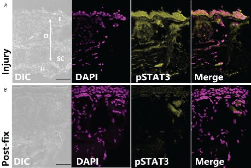 Figure 4. pSTAT3-ir increases after full thickness injury of dorsal skin. (A) The highest pSTAT3 activation was associated directly with the injured edge of the explant (integrated density: 589,578 ± 201,764 ADU, n = 3). (B) By contrast, the end of tissue explant that was non-injured and cut after fixation had less pSTAT3-ir activation (integrated density: 267,042 ± 45,092 ADU). |