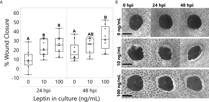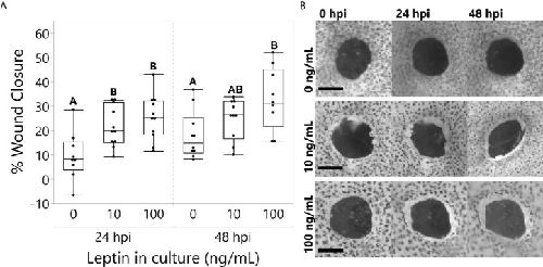 Figure 5. Leptin treatment (0, 10, and 100 ng/ml) in culture media significantly improved wound healing in juvenile Xenopus laevis dorsal skin explants at 48 h of culture. (A) At 24 h, treatments at both 10 and 100 ng/ml significantly increased wound closure compared to the control, and by 48 h, the 100 ng/ml treatment continued to improve wound healing compared to the control (repeated-measures MANOVA, treatment = 0.0034, Tukey’s HSD, p < 0.05, n = 12/treatment). (B) Representative samples of dorsal skin explants in culture showing the interior wound of the “punch-in-a-punch” donut-shaped biopsy. Wound closure measured as the total area reduction of the central wound compared to 0 hpi. Scale bars, 0.5 mm. |