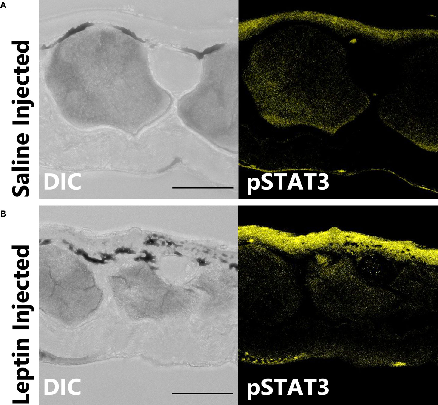 FIGURE 2 Leptin stimulates JAK/STAT signaling in skin. Leptin-induced phosphorylated STAT3-ir (pSTAT3-ir, yellow) in 16-µm sections of juvenile Xenopus laevis dorsal skin; skin was fixed 6 h after intraperitoneal injection with (A) saline or (B) leptin. Leptin stimulates pSTAT3-ir strongly in the epidermis and at the apical end of the granular glands and hypodermis (representative image from n = 3). Scale bar, 100 µm (n = 3). Epidermis (E), dermis (D), stratum corneum of the dermis (SC), and thin hypodermis (H). Scale bar, 50 µm. |