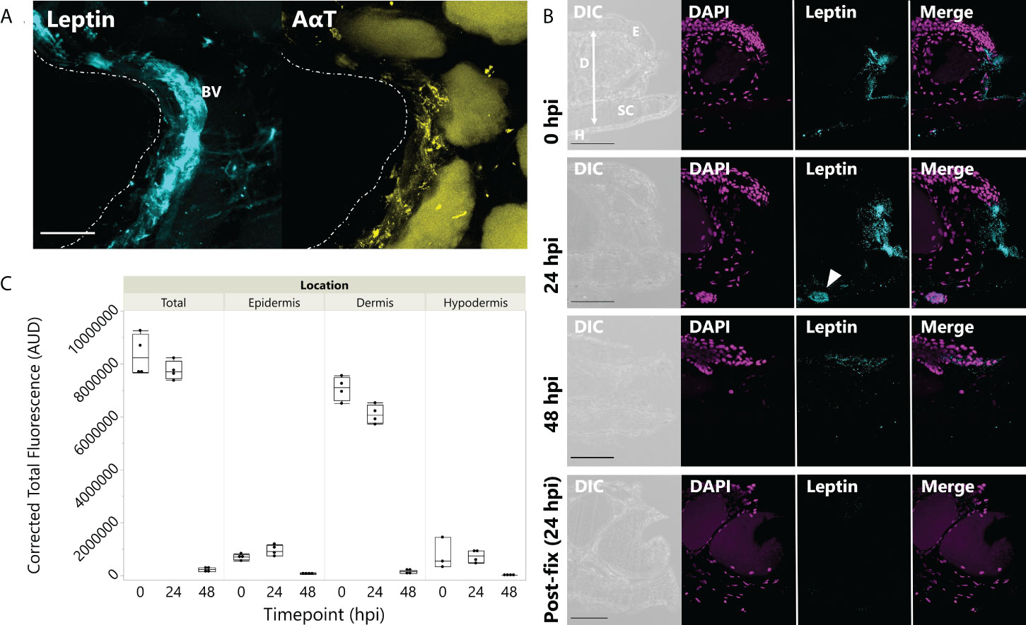 Figure 3. Leptin protein is rapidly localized to injured skin. (A) Whole mount of leptin protein (aqua) and acetylated α-tubulin (AαT, yellow) at the time of injury in juvenile Xenopus laevis dorsal skin. Dotted line indicates injury at the center of the donut-shaped explant. Leptin is highly expressed in blood vessels and nerve tissue (indicated by AαT) associated with the injury site. Granular glands are autofluorescent after bleaching and clearing at 488 nm (as seen in the AαT panel). Scale bar, 100 µm. (B) Leptin protein expression in 16-µm cross sections of juvenile X. laevis dorsal skin after injury. Leptin expression (aqua) is concentrated in the injured tissue at 0 and 24 hpi and nearly depleted by 48 hpi in vitro except for some localized in the epidermis (DAPI, magenta). Epidermis (E), dermis (D), stratum corneum of the dermis (SC), and thin hypodermis (H). Arrow in 24 h panel indicates blood vessel. Scale bars, 100 µm. (C) Leptin is most highly expressed in the central dermis after injury, but expression within 300 µm of the injury site in all skin layers is depleted by 48 hpi in culture (standard least squares ANOVA, time point, p < 0.0001). |