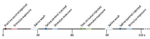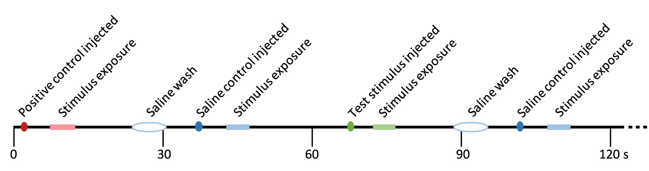 This timeline represents a short segment of an experiment, illustrating the order and timing of events. Stimuli were injected into a port in the perfusion line (colored dots), traveled down the perfusion line for several seconds, then washed across the olfactory epithelium (“stimulus exposure” period, marked on timeline). EOG responses were observed during this exposure time if evoked by the stimulus. Positive controls (shown in red; amino acids such as methionine and alanine) were used to elicit a strong EOG response at the start and end (not shown) of each recording block. After positive controls or test stimuli, a saline wash was administered to ensure the port and line were clean (white oval). Saline was also used as a negative control (blue). Test stimuli (green) at various dilutions were alternated with negative controls for the bulk of each recording block.