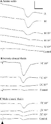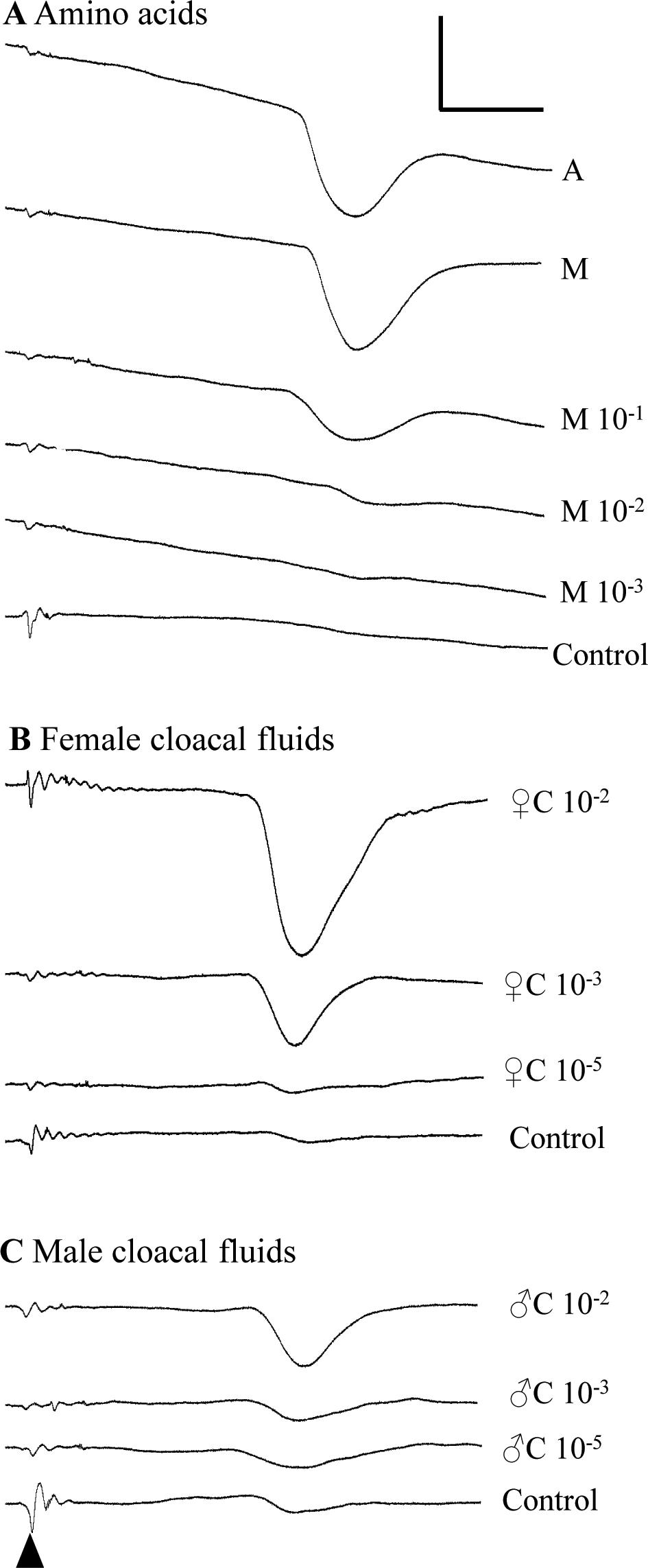 EOG traces are shown in response to (A) amino acids, (B) female cloacal fluids, and (C) male cloacal fluids. The stimulus was injected into the perfusion line at the beginning of each trace (indicated with the black caret), creating a small stimulus artifact, with EOG response occurring 6–8 seconds later (large downward deflections). Stimuli and relative concentration are indicated to the right of each trace (A is 1 mM alanine; M is 1 mM methionine; C is cloacal fluid). Control in (A) was saline; controls in (B) and (C) were cloacal-specific controls (saline passed through the cloacal fluid collection process). Scale bar is 1 mV (vertical) and 3 s (horizontal). Data were from Frog 8; summary data can be found on subsequent figures.