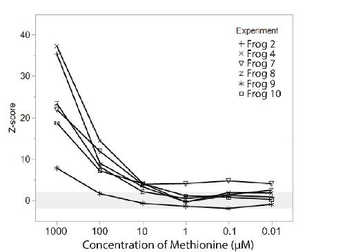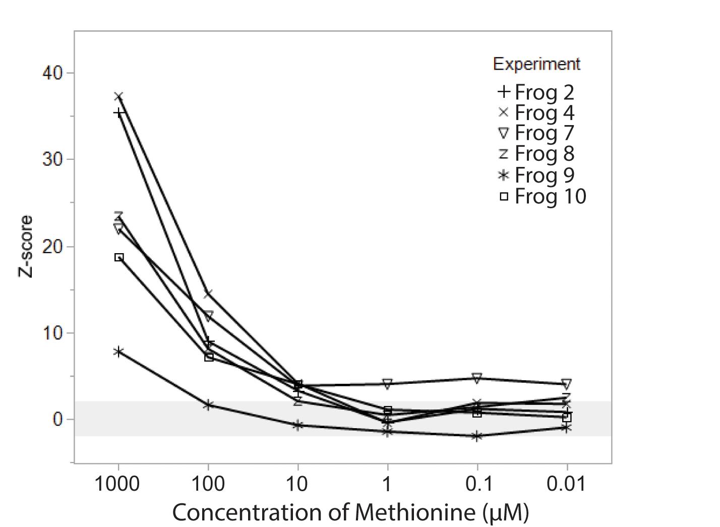 EOG amplitude, represented as z-score relative to control (saline) stimuli, are shown for 6 individuals across 6 concentrations, ranging from 1 mM to 0.01 μM L-methionine. EOG response declined at lower concentrations, with the detectability threshold (z ≥ 2) falling between 10 and 1 μM for most animals. Individual animals are shown with distinct symbols; light gray horizontal band from z = -2 to z = 2 indicates responses that may not be distinguishable from saline control.