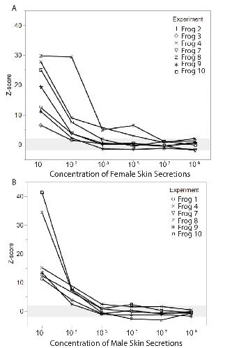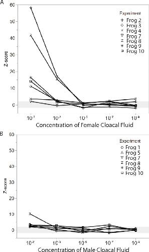 Fig 5. EOG responses to different concentrations of cloacal fluids from female and male conspecifics, represented as z-score relative to cloacal control stimuli.