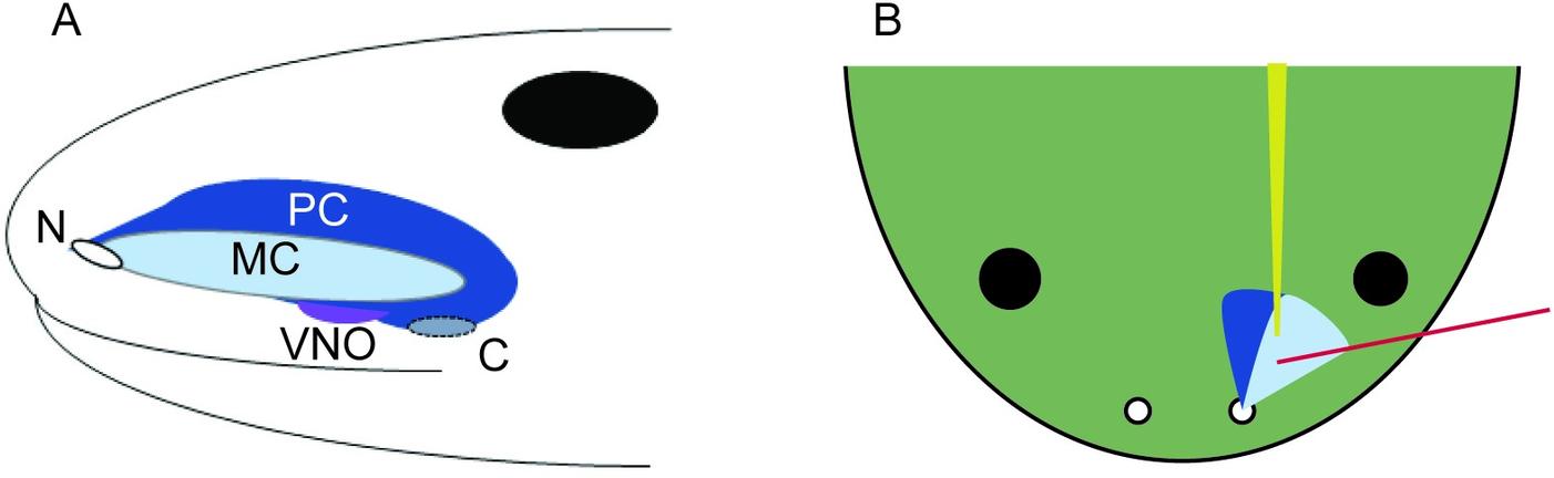 The medial cavity (MC, light blue) or water nose is a blind-ended compartment, opening only at the naris (N). The principal cavity (PC, dark blue) or air nose is a separate compartment that connects the naris to the oral cavity via the choana (C). The vomeronasal organ (VNO, purple) sits in the inferior aspect of the PC. Large black dots represent the animal’s eyes. (A) Schematic of olfactory anatomy, lateral view, as described by Reiss & Eisthen, 2014 [5]. (B) Schematic of experimental preparation, dorsal view. The EOG recording electrode is shown in red; it was placed along the medial wall of the MC. The profusion system that was used to deliver stimuli is represented in yellow.