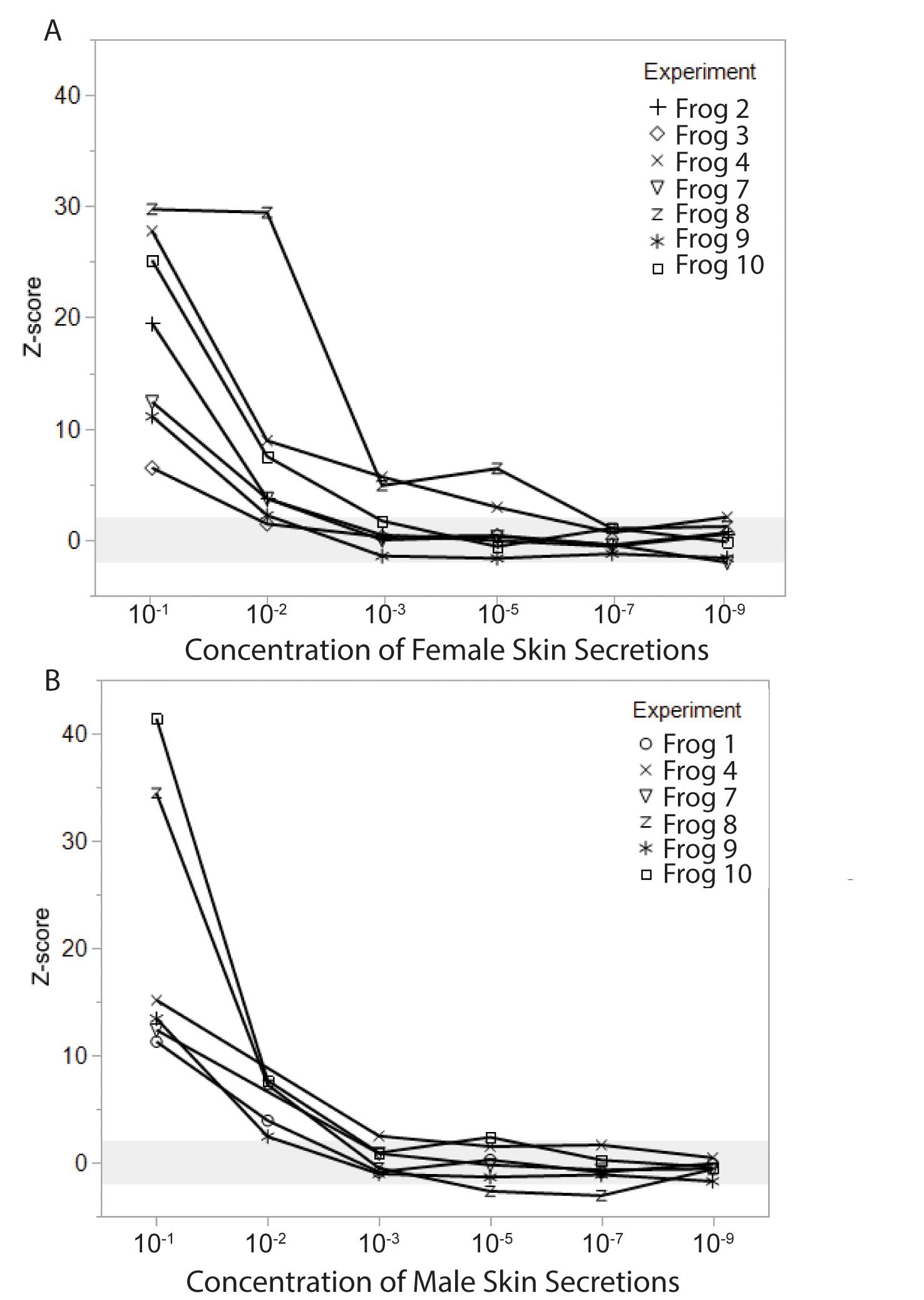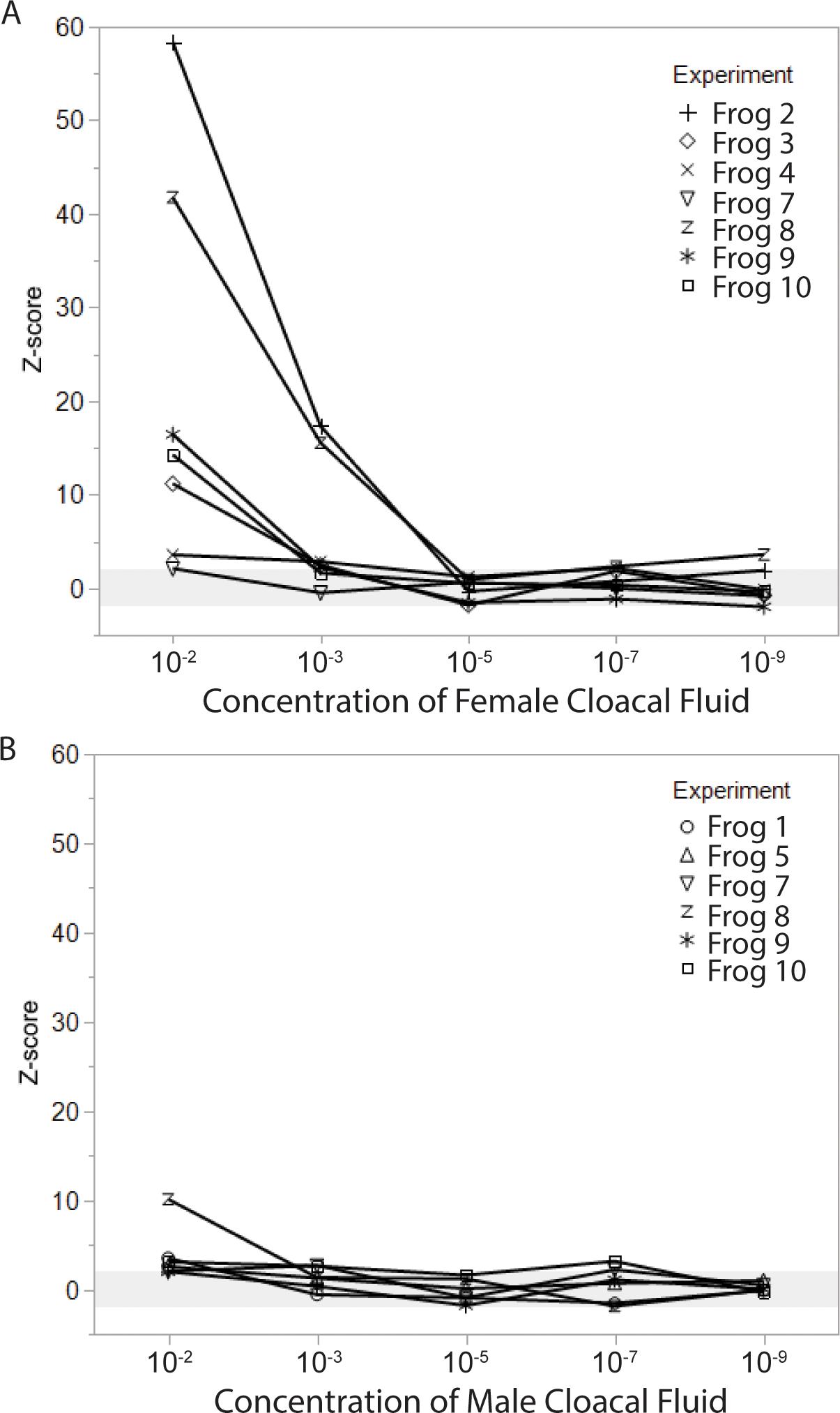 (A) EOG amplitudes in response to female cloacal fluids were robust at 10−2 concentration, and declined at lower concentrations, with the detectability threshold (z ≥ 2) falling between 10−3 and 10−5 for most animals. (B) EOG amplitudes to male cloacal fluids were far smaller, with a detection threshold between 10−2 and 10−3 for most animals.