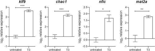 Figure 3. T3 increases the expression of chac1, nfic and mat2a after 16âhours in the tadpolebrain. RTqPCR was performed in whole brain samples of control tadpoles and T3-treated tadpoles for klf9 (A) as a positive control of T3 induction, and chac1 (B), nfic (C), and mat2a (D), genes induced by T3 in NSPCs after 16âhours. The expression of each gene was normalized to eef1a1 and compared to the control condition in 2 (nrep) or 3 (klf9 and thrβA) independent biological replicates and plotted as log2-expression. *P <â0.05, **P <â0.01, ***P <â0.001, unpaired Student's t-test