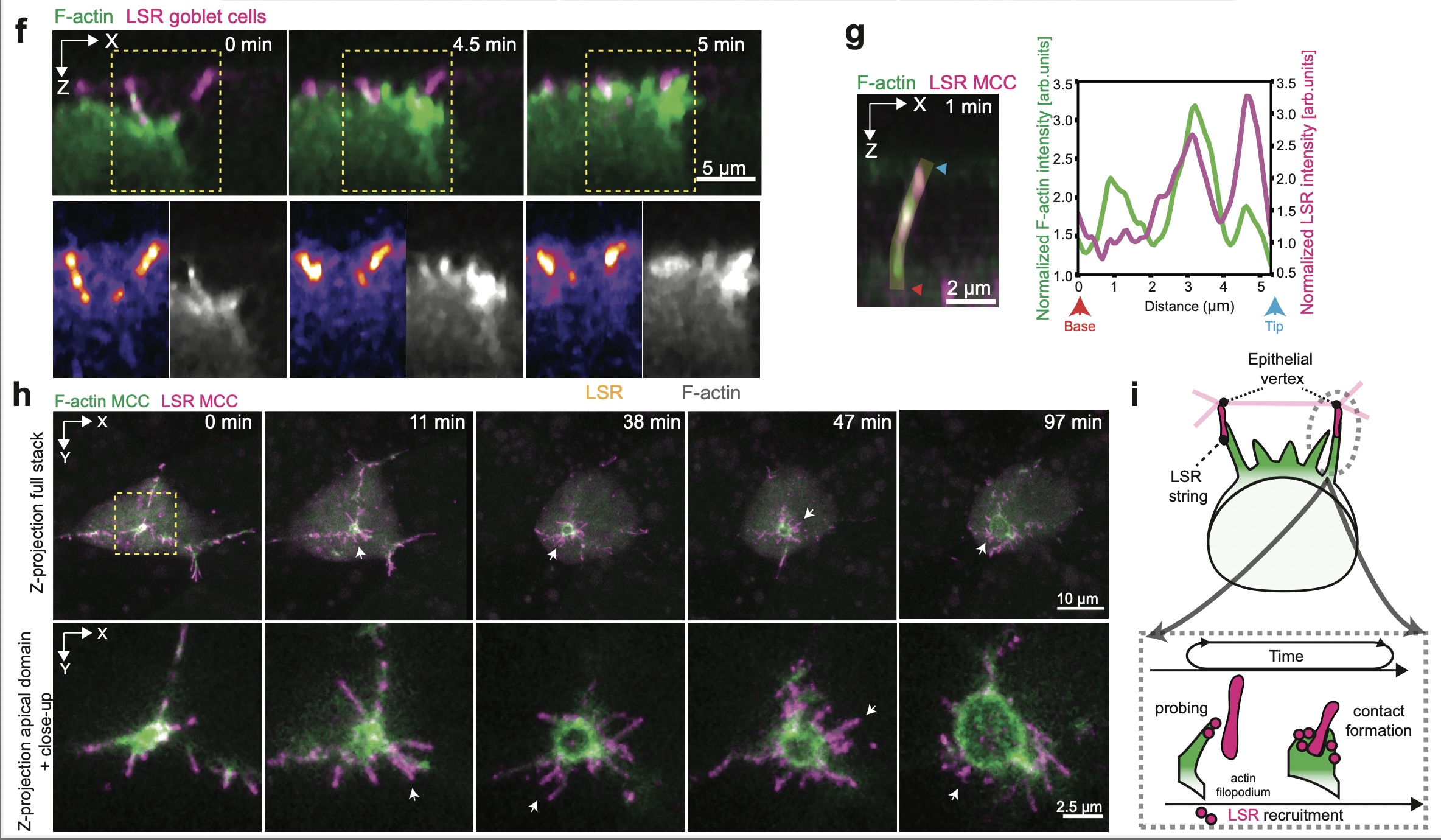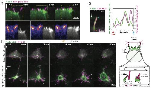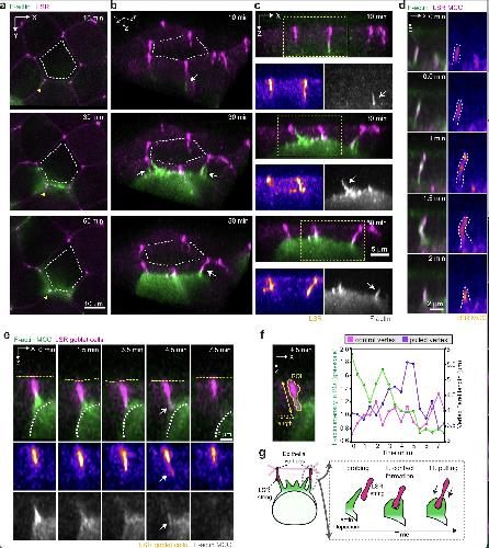 Supplementary Fig. 2 Filopodia interact directly with epithelial vertices. [continued] f, Orthogonal (XZ) projections of integrating MCC expressing α-tubulin::LifeAct-RFP interacting with vertices labeled by LSR-GFP (pseudo-colored in magenta) under nectin promoter expression. Insets depict F-actin recruitment in the MCC to stabilize the new contact. Scale bar: 5 μm. g, Plot profile of F-actin and LSR along filopodium from Fig. 2d. Normalized fluorescence intensity values for F-actin and LSR are plotted from the base to the tip of filopodium. Scale bar: 2.5 μm. h, Image sequence of LSR-overexpressing MCC. The apically expanding MCC expresses α-tubulin::LifeAct-RFP (pseudo-colored in green), and α-tubulin::LSR-RFP (pseudo-colored in magenta). Ectopic protrusions are marked with white arrows. Top row: Full projection. The yellow box marks inset for the bottom row, with a close-up on the apical domain. i, Schematics representing LSR recruitment to the leading edge of integrating MCC. |
