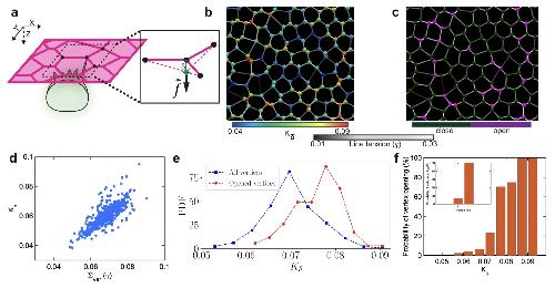a Schematics represent the out-of-plane force (f) exerted by an integrating MCC on an epithelial vertex inducing an out-of-plane displacement (δ). b Representative snapshot of the simulated cellular network. The colormap on junctions indicates line tension (γ), while the vertices are color-coded according to their stiffness (Kδ). c Representative snapshot of the cellular network illustrating propensity of vertices to open upon cell integration. Purple (dark green) vertices mark vertices with successful (failed) insertions. d Vertex stiffness increases with the increasing sum of line tensions at each vertex. e The probability density function (PDF) of the vertex stiffness distributions for all vertices in the simulated cellular network (blue) and the vertices with successful integration events were (red). f The probability of vertex opening for varying vertex stiffness values. The inset shows the opening probability for threefold vs. fourfold vertices. |