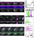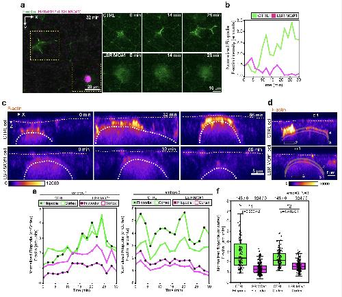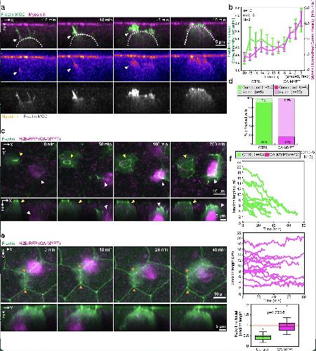 Integrating MCCs express F-actin marker (LifeAct, pseudo-colored in green) under MCC-specific α-tubulin promoter while overlying goblet cells express F-actin marker (Utrophin-RFP, pseudo-colored in magenta) under goblet cell-specific nectin promoter. a, Snapshots of the different steps of the MCC integration process: probing (when MCCs move into the superficial layer), insertion (when MCCs are stably positioned at an epithelial vertex) and apical expansion (when MCCs join the tissue by expanding their apical domain). Yellow arrowheads mark epithelial vertices. In the corresponding orthogonal (XZ) projections, yellow arrowheads mark epithelial vertices and the white arrow indicates a F-actin filopodium. White dotted lines outline the cortex of the integrating MCC. Scale bars: 5 μm. b, 3D rendering of integrating MCC interacting with different vertices (filopodia marked by arrowheads)(MCC from Fig. 1b-d and Supplementary Video 1). c, Representation of filopodia dynamics quantification. Different regions of interest (ROIs) corresponding to the background (1), cortex (2) and filopodia (3) are drawn and used to extract F-actin intensities (See Methods). Scale bar: 5 μm. |