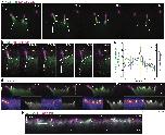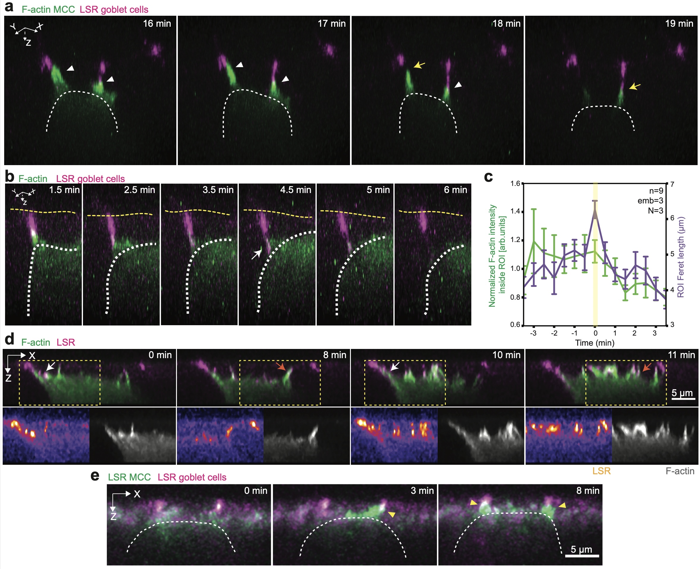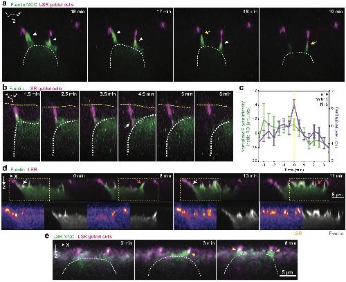 Supplementary Fig. 2 Filopodia interact directly with epithelial vertices. a, 3D rendering of integrating MCC during the probing phase. The MCC (expressing α-tubulin::LifeAct-RFP, pseudo-colored in green) uses filopodia to attach to the vertices of epithelial goblet cells (expressing nectin::LSR-RFP, pseudo-colored in magenta). White arrowheads depict filopodia-vertex contact and yellow arrows depict contact retraction. b, 3D rendering from Fig. 2e of filopodium pulling on vertex (marked by white arrow). White dotted line outlines the cortex of integrating MCC and the yellow dotted line outlines the top of the superficial epithelium. c, Epithelial vertex-pulling quantification. Average MCC F-actin intensity (green) and vertex length (purple) during pulling and retraction. T=0 marks the vertex length maxima. Data show mean ± SEM (n=9 pulling events from 3 embryos from N=3 experiments). d, Orthogonal (XZ) projections of integrating MCC (expressing α-tubulin::LifeAct-RFP, pseudo-colored in green) expressing LSR-3xGFP (pseudo-colored in magenta). LSR-3xGFP is recruited to the contact points between the MCC and the vertex (white arrows, t=0 min and t= 10 min) and to filopodia (orange arrows, t=8 min and t=11 min). Yellow boxes mark insets with separate channels. Scale bar: 5 μm. e, Orthogonal (XZ) projections of integrating MCC expressing α-tubulin::LSR-GFP (pseudo-colored in green) interacting with vertices labeled with LSR-RFP expressed under nectin promoter (pseudo-colored in magenta). Yellow arrowheads mark LSR-LSR co-localization. Scale bar: 5 μm. |