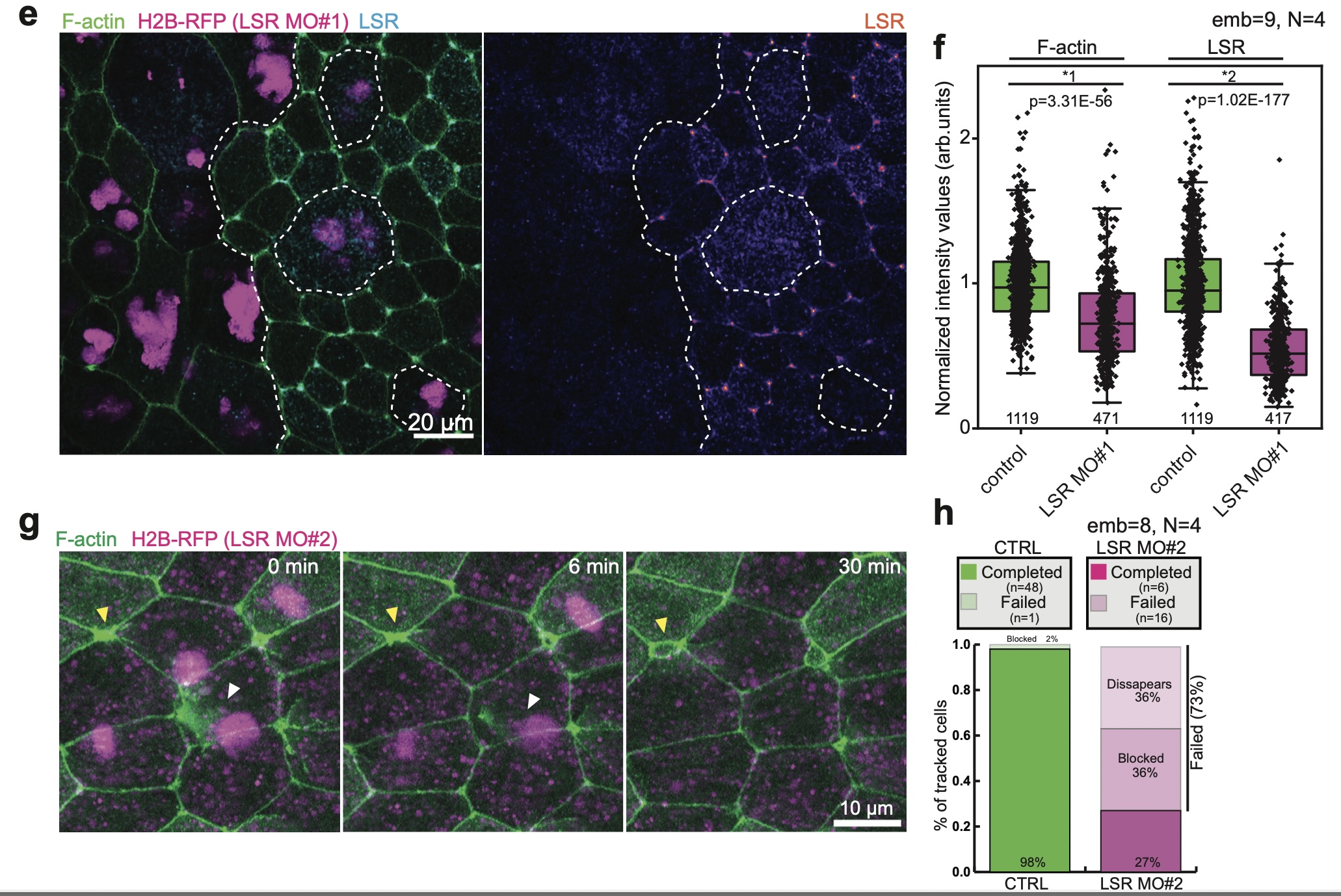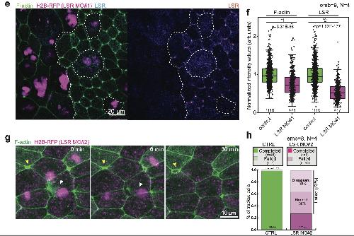 Supplementary Fig. 3 LSR regulates MCC integration. [continued] e, Immunofluorescence images of LSR-stained superficial epithelial layer (F-actin pseudo-colored in green and LSR pseudo-colored in cyan). The white dotted line marks the boundaries between control and LSR-depleted goblet cells (marked by H2B-RFP, pseudo-colored in magenta). f, Distribution of normalized F-actin and LSR intensities in control (in green, total n=1119 vertices, 9 embryos, N=4 experiments) and LSR-depleted cells using LSRMO#1 (in magenta, total n=471 vertices, 9 embryos, N=4 experiments). Boxes extend from the 25th to 75th percentiles, with a line at the median and whiskers representing range within 1.5 interquartile range. Two-tailed Mann-Whitney test with 0.05 significance level *1 p=3.31E-56 *2 p=1.02E-177. g, LSR-depleted cell (LSR MO#2, marked with H2B-RFP, pseudo-colored in magenta) expressing LifeAct-GFP (pseudo-colored in green) fails to integrate (marked by white arrowhead). A control MCC is marked by a yellow arrowhead. h, Quantification of integration success rates. LSR-depleted MCCs are either blocked or disappear (nWT= 48 cells, nLSRMO#2 = 22 cells from 8 embryos, N=5 experiments) |