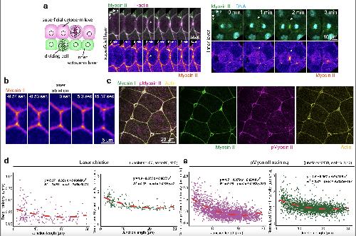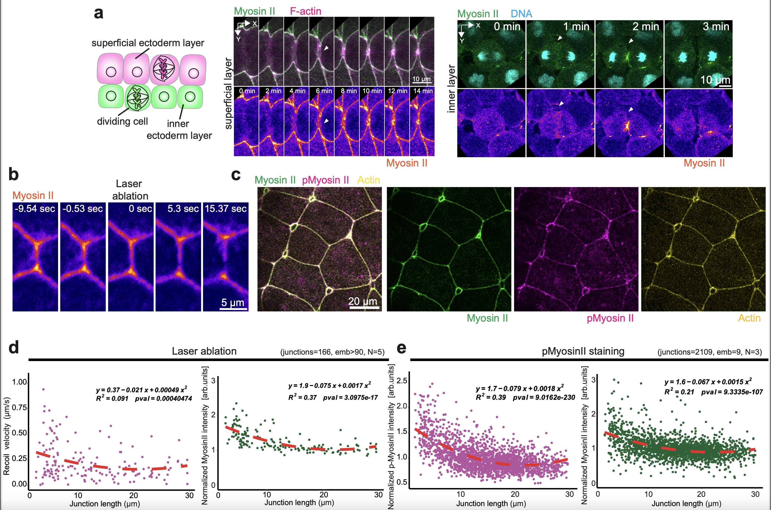 Supplementary Fig. 5: Validation of myosin II sensor and vertex model predictions. a-e, The SF9-3xGFP myosin II sensor serves as a proxy for junctional tension. a, The SF9-3xGFP sensor (myosin II) localizes to the cleavage furrow of superficial (left panel) and inner (right panel) dividing ectodermal cells. b, Laser ablation of superficial epithelial cell junctions. Myosin II is pseudo-colored in fire. c, Phosphomyosin-II staining of superficial epithelium expressing the SF9-3xGFP myosin II sensor. SF9-3xGFP myosin II sensor (myosin II) is pseudo-coloured in green, active phosphorylated myosin (pmyosin II) is pseudo-coloured in magenta and F-actin is pseudo-coloured in yellow. d, Analysis of laser ablation data. For recoil data: equation (y=0.37-0.021x+0.0004074x^2), goodness of fit (R2=0.091) and two-sided F-test p-value (0.0004074). For myosin II: equation (y=1.9-0.075x+0.0017x^2), goodness of fit (R2=0.37) and two-sided F-test p-value (3.0975e-17) (junctions=166 from >90 embryos, N=5 experiments). e, Analysis of phosphomyosin II (pmyosin II) and SF9-3xGFP (myosin II) staining data. For pmyosinII data: equation (y=1.7-0.079x+0.0018x^2) , goodness of fit (R2=0.39) and F-test p-value (9.0162e-203). For myosin II: equation (y=1.6-0.067x+0.0015x^2) , goodness of fit (R2=0.21) and F-test p-value (9.3335e-107) (junctions=2109 from 9 embryos, N=3 experiments). |