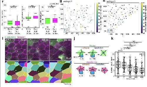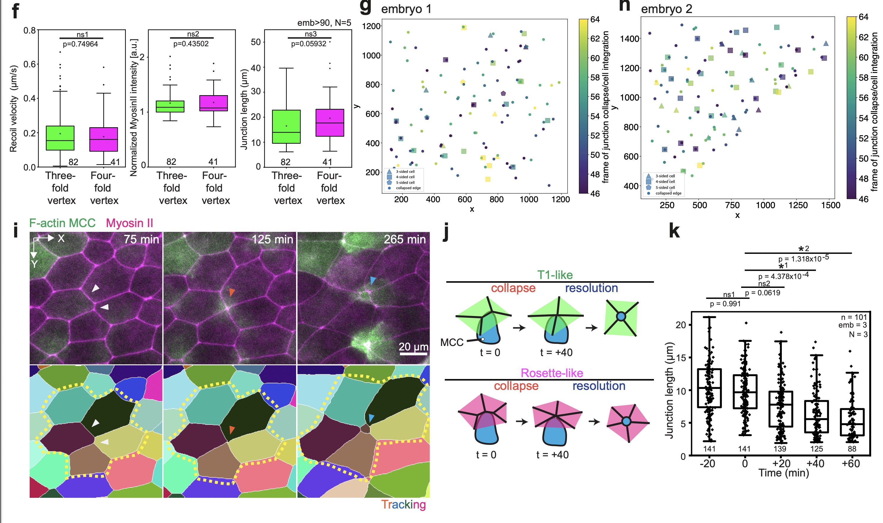 Supplementary Fig. 5: Validation of myosin II sensor and vertex model predictions. [continued]f, Comparison of recoil velocities, myosin II intensities and length between junctions connected to either three-fold vertex or four-fold vertex (82 three-fold vertices and 41 four-fold vertices from >90 embryos, N=5 experiments). Boxes extend from the 25th to 75th percentiles, with a line at the median and whiskers representing range within 1.5 interquartile range. Two-tailed Mann-Whitney test with 0.05 significance level. ns1 p=0.74964, ns2 p=0.43502, ns3 p=0.05932. g-h, Spatial correlation between epithelial junction collapse (circles) and MCC integration (polygons), colored by the time of occurrence for two different embryos. i, Example of a higher-fold MCC integration. Top panel, snapshots of MCC integrating in a higher-order vertex. MCC is labeled with α-tubulin::LifeAct-RFP (pseudo-colored in green) and the myosin intrabody with SF9-3xGFP (pseudo-colored in magenta). Bottom panel, Segmented image. White arrowhead mark initial epithelial junction layout, orange arrowhead mark junction collapse and cyan arrowhead marks apical expansion. The yellow outline depicts the formation of a rosette-like structure. Scale bar: 20 μm. j, Schematics of cell integration at higher-fold vertices, which is divided in a remodeling phase and a resolution phase. Integration at a 4-fold vertex resembles a T1 event (T1-like) whereas 5-fold integration or higher resembles the formation of a rosette (Rosette-like). k, Epithelial junction length distribution involved in formation of higher-order vertices. T=0 marks the onset of MCC reaching the overlying junction (number of junctions is specified for each timepoint, n=101 cells from 3 embryos, N=3 experiments). Boxes extend from the 25th to 75th percentiles, with a line at the median and whiskers representing range within 1.5 interquartile range. One-way Analysis of Variances (ANOVA) with Tukey’s test and a significance level of 0.05 was used to compare difference junction lengths with the reference junction length (junction length at the onset of MCC integration, T=0). ns1 p=0.991, ns2 p=0.0619, *1 p= 4.378E-4, *2 p=1.318E-5. |