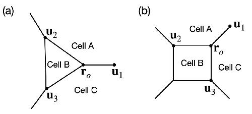 Supplementary Figure 12. Schematics of symmetric insertion of cell B at a three-fold vertex (a), and at a four-fold vertex (b) at location ro. Upon integration, each vertex of cell B is subject to forces stemming from the line tension of the 3 connected bonds in directions u1 ro, u2 ro and u3 ro and the pressure di↵erence between cell B and its neighboring cells A and C (see Supplementary Note 1). |