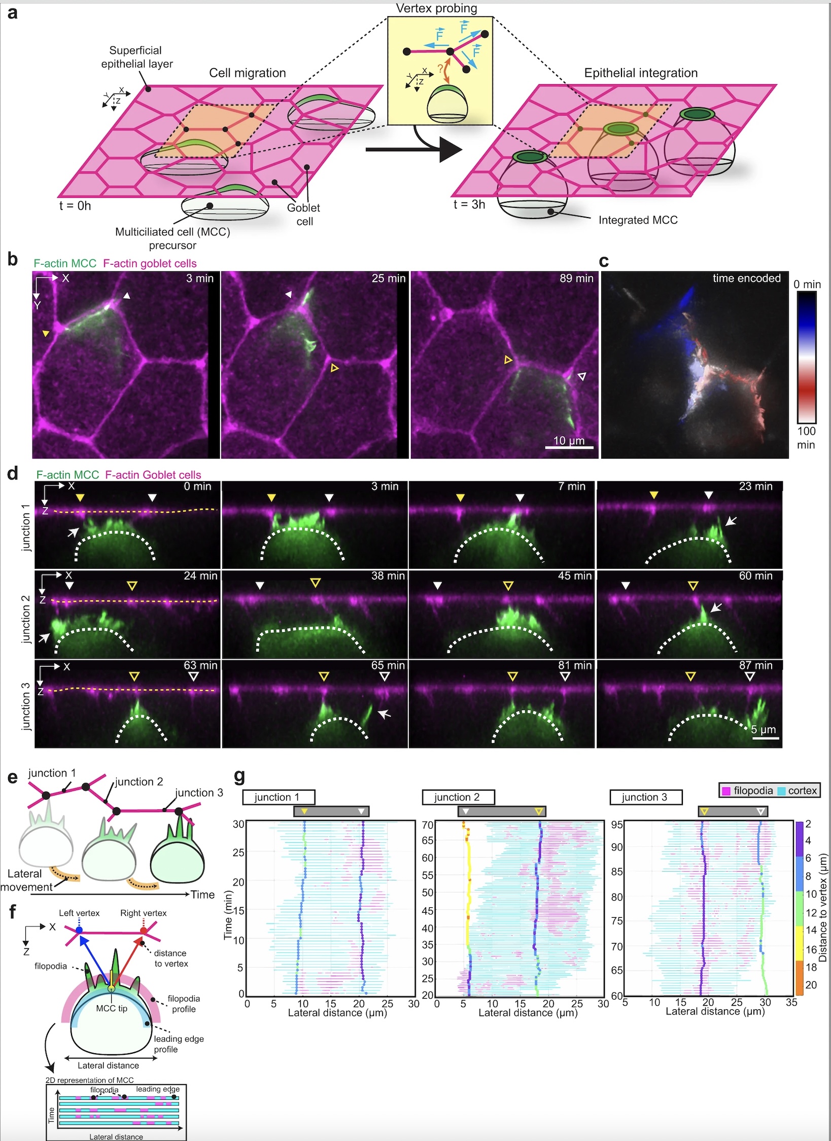 a Schematics representing multiciliated cell (MCC) integration into the superficial epithelium. MCCs (in green) migrate into the superficial epithelium (t = 0 h) to integrate at the epithelial vertices formed by the neighboring goblet cells (in magenta) (t = 3 h). Inset depicts vertex probing by a single MCC. Epithelial vertices (black dots) form hotspots of mechanical tension as connecting junctions (magenta) pull on the vertex (blue arrows). b–g Dynamics of vertex probing by MCCs. MCC expresses α-tubulin::LifeAct-GFP (pseudo-colored in green) while goblet cells express nectin::utrophin-RFP (pseudo-colored in magenta). Yellow and white arrowheads, with and without fill, mark the position of different vertices and white arrows point to filopodia. b Image sequence from XY projection of MCC moving in between the overlying goblet cells. Scale bar: 10 μm. c Temporal-color-coded XY projection of MCC in b. d Orthogonal (XZ) projections of MCC in b used for filopodia dynamics analysis. White dotted lines outline the MCC contour and yellow dotted lines outline the top of the superficial epithelium. Arrowheads mark the position of the epithelial vertices. Scale bar: 5 μm. e Schematics representing the lateral movement of integrating MCCs. f Schematic representation of the main components of the filopodia analysis pipeline (see “Methods”). g Filopodia analysis of integrating MCC from d. The relative position of F-actin protrusions (filopodia, magenta) extended by a single MCC from its leading-edge (cyan, each line representing an individual time point) and the overlying epithelial vertices (vertical tracks, color-coded for the distance to vertex (between the MCC tip and the left or right vertex)) during MCC lateral movement. Arrowheads mark the position of the epithelial vertices as in d. |