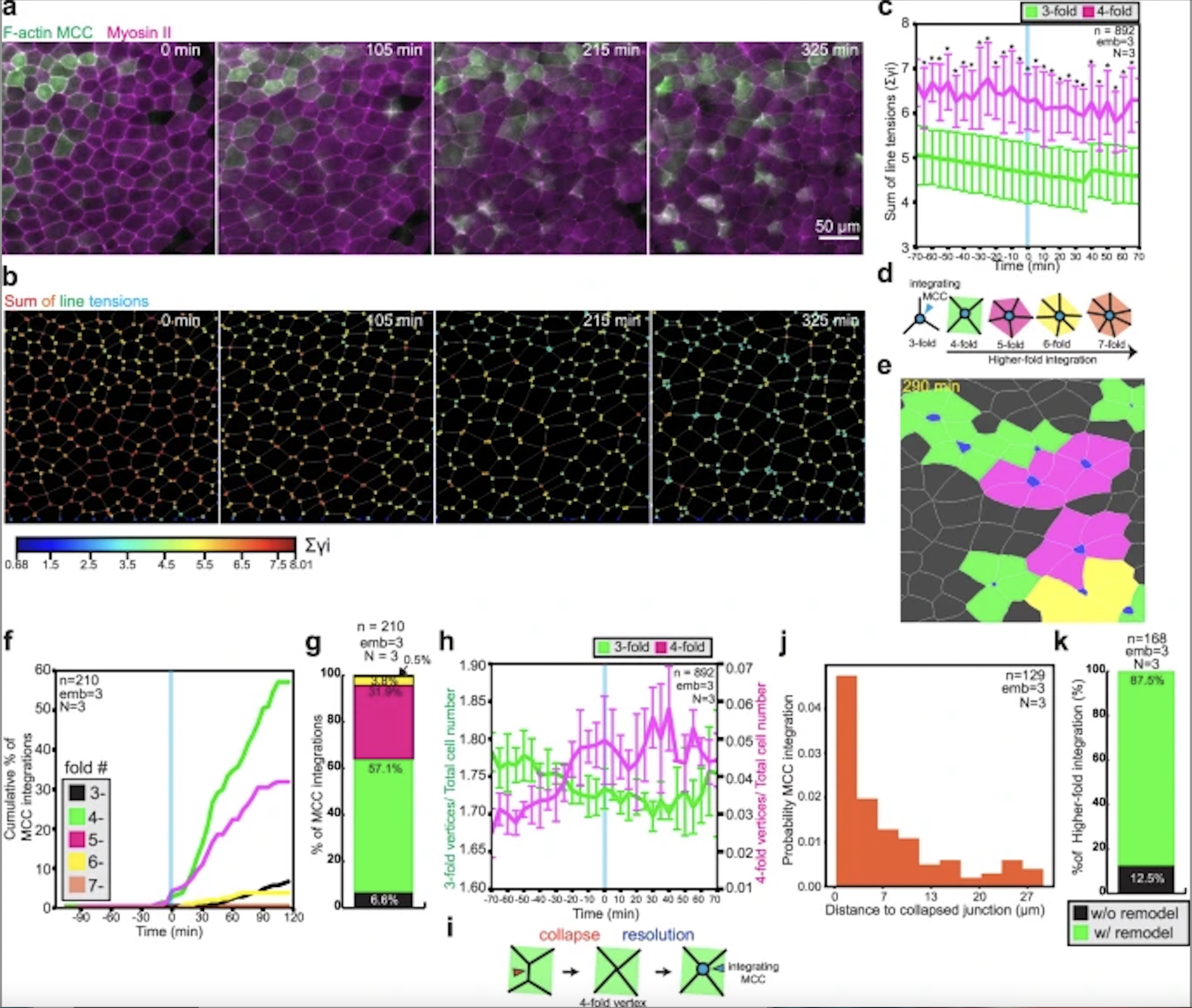 a Snapshots of superficial epithelium throughout MCC integration. MCCs and myosin II are labeled by expressing α-tubulin::LifeAct-RFP (pseudo-colored in green) and the myosin intrabody SF9-3xGFP (pseudo-colored in magenta), respectively. Scale bar: 50 μm. b Sum of line tensions across time color-coded from low (blue) to high tensions (red) extracted from a. c Sum of line tensions for threefold vertices (green) and fourfold vertices (magenta) during MCC integration (from n = 892 cells from 3 embryos, N = 3 experiments). Data show mean ± SD, asterisks represent significant statistical differences between datasets. Two-tailed Mann–Whitney test *p = [2.00E−13, 0.00176]. d–g Quantification of MCC integration according to the number of neighboring goblet cells. d Schematics representing higher-fold integrations, color-coded according to the number of neighboring cells. e Segmented image depicting higher-fold cell integrations, color-coded according to d. Apically expanding MCCs are marked in blue. f Cumulative percentage of MCC integrations across time. T = 0 marks the onset of MCC integration (defined as the 1% addition of new MCCs into the epithelium) (n = 210 cells from 3 embryos, N = 3 experiments). g Total percentage of MCC integrations according to the number of neighboring cells. (n = 210 cells from 3 embryos, N = 3 experiments). h Time evolution of threefold vertices (green) and fourfold vertices (magenta) number (from n = 892 cells from 3 embryos, N = 3 experiments). T = 0 (blue line) marks the onset of MCC integration (defined as the 1% addition of new MCCs into the epithelium). Data show mean ± SEM. i Schematics representing junction collapse (orange arrowhead) into a fourfold vertex and resolution by MCC integration (blue arrowhead). j The probability of MCC integration as a function of distance to the location of the closest junction collapse. k Relative percentages of MCC integration with (green) and without (black) junction remodeling (n = 168 cells from 3 embryos, N = 3 experiments). |