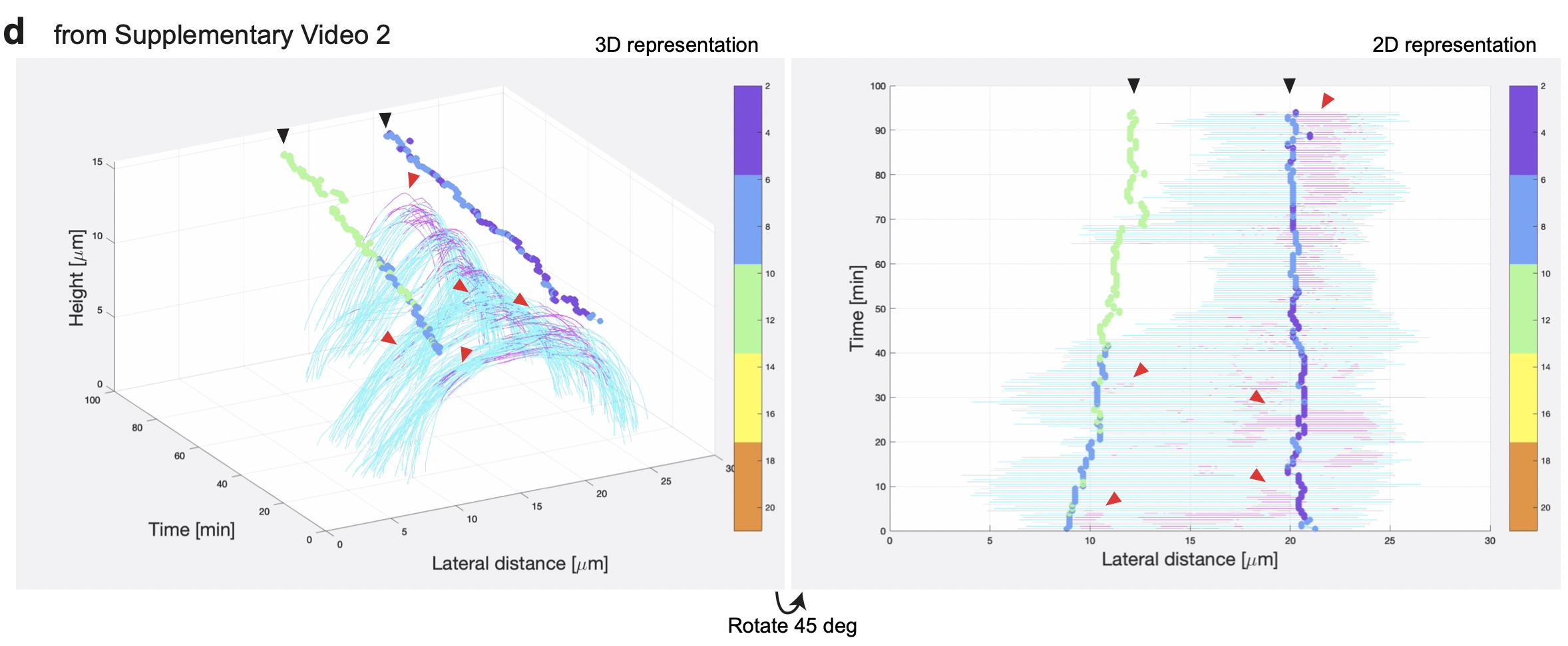 Supplementary Fig. 1 Filopodia dynamics during the probing phase of MCC integration. [continued] d, Representation of different modes of visualization of filopodia activity (stills adapted from Supplementary Video 2). F-actin filopodia extended by a single MCC are labeled in magenta while the MCC leading-edge is labeled in cyan. The overlying vertices are represented by the vertical tracks marked by black arrowheads, color-coded for the distance between the MCC tip and the left or right vertex during the probing phase. Lateral distance in μm describes the distance migrated in XY, whereas Height in μm describes the distance migrated in the axial direction. Red arrowheads mark filopodia-vertex interactions. |