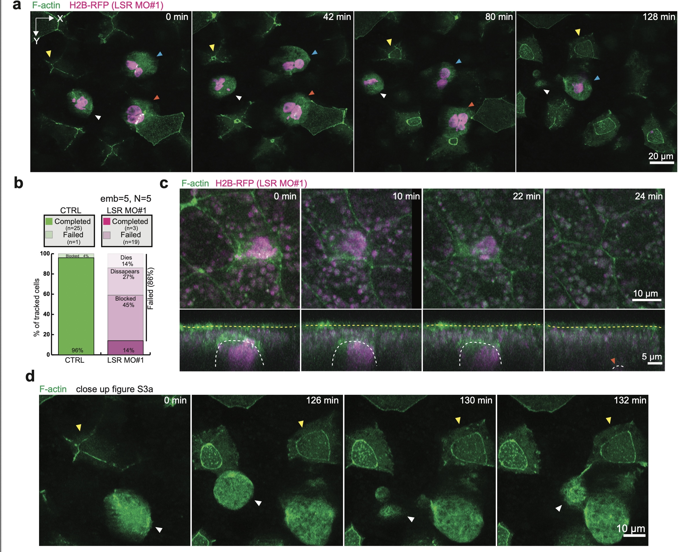 Supplementary Fig. 3 LSR regulates MCC integration. a,c,d, Control and LSR-depleted cells (LSR MO#1, marked with H2B-RFP, pseudo-colored in magenta) expressing LifeAct-GFP (pseudo-colored in green). a, Image sequence of control MCC (yellow arrowhead) and LSR-depleted MCCs. LSR-depleted cells fail to integrate (blocked, cyan arrowhead), migrate back inside the tissue (disappear, orange arrowhead) or undergo cell death (dies, white arrowhead). Scale bar: 20 μm. b, Quantification of integration success rates. LSR-depleted MCCs are either blocked, disappear, or die (nWT= 26 cells, nLSRMO#1 = 22 cells from 5 embryos, N=5 experiments). c, Image sequence depicting disappearance of LSR-depleted MCC (marked by orange arrowhead). d, Image sequence (close-up of figure S3a) depicting cell death of LSR-depleted MCC (marked by white arrowhead). A control MCC is marked by a yellow arrowhead. Scale bar: 10 μm. |