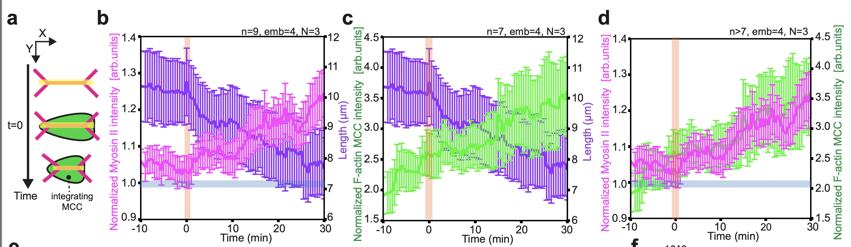 Supplementary Fig. 6 MCCs pull on overlying epithelial vertices to induce junction collapse. a-k, Orange vertical bars and arrowheads mark the onset of epithelial junction collapse, cyan vertical bars and arrowheads mark the onset of junction retraction. a, Schematics representing epithelial junction (in magenta) collapse quantification during MCC (in green) integration. t=0 indicates the start of epithelial junction collapse, which coincides with MCC reaching the overlying junction. b, Average normalized junctional myosin-II intensity (magenta) and junction length (purple) before and during junction collapse (t=0, the start of junction collapse)(n=9 junctions from 4 embryos, N=3 experiments). c, Average normalized MCC F-actin intensity (green) and junction length (purple) before and during junction collapse (t=0, the start of junction collapse)(n=7 junctions from 4 embryos, N=3 experiments). d, Normalized junctional myosin-II intensity (magenta) and normalized MCC F-actin intensity (green) during junction collapse (t=0, the start of junction collapse)(n>7 junctions from 4 embryos, N=3 experiments). |