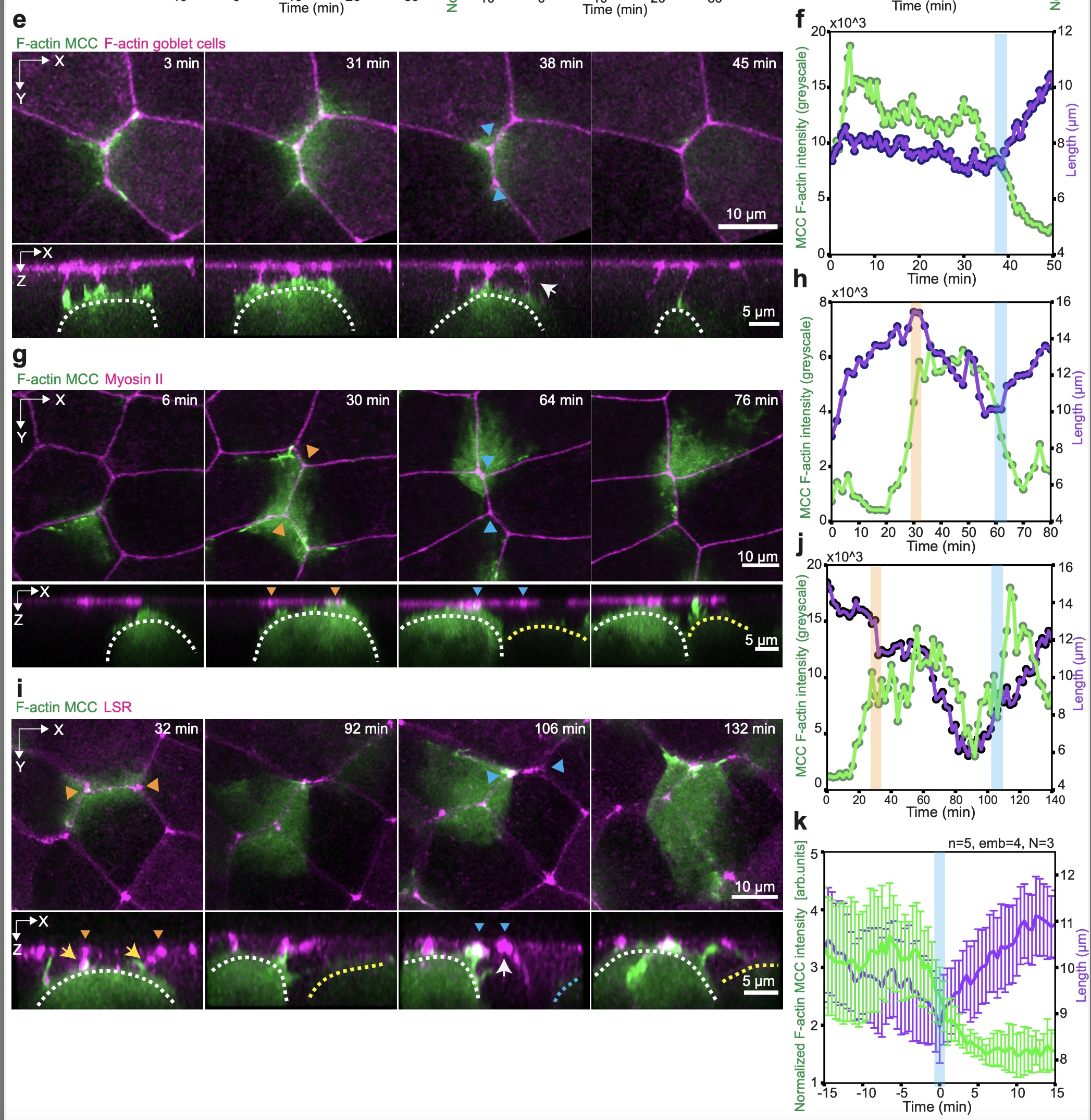 e,g,i, Image sequence depicting epithelial junction retraction after MCC (pseudo colored in green) loses contact (marked by cyan arrowheads) with the vertex. Junctions are labeled with nectin Utrophin-RFP in e, SF9-3xGFP in g and LSR-3xGFP in i. White dotted line marks the cell of interest, the yellow dotted line marks the competing MCC. The yellow and white arrows mark contact formation and loss with the vertex, respectively. f,h,j, Corresponding MCC F-actin intensity in grey values (green) and junction length (purple) during junction retraction. k, Average normalized MCC F-actin intensity (green) and junction length (purple) before and after retraction (marked by t=0)(n=5 junctions from 4 embryos, N=3 experiments). b-d, k, data show mean ± SEM. |
