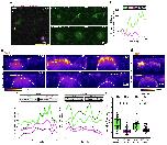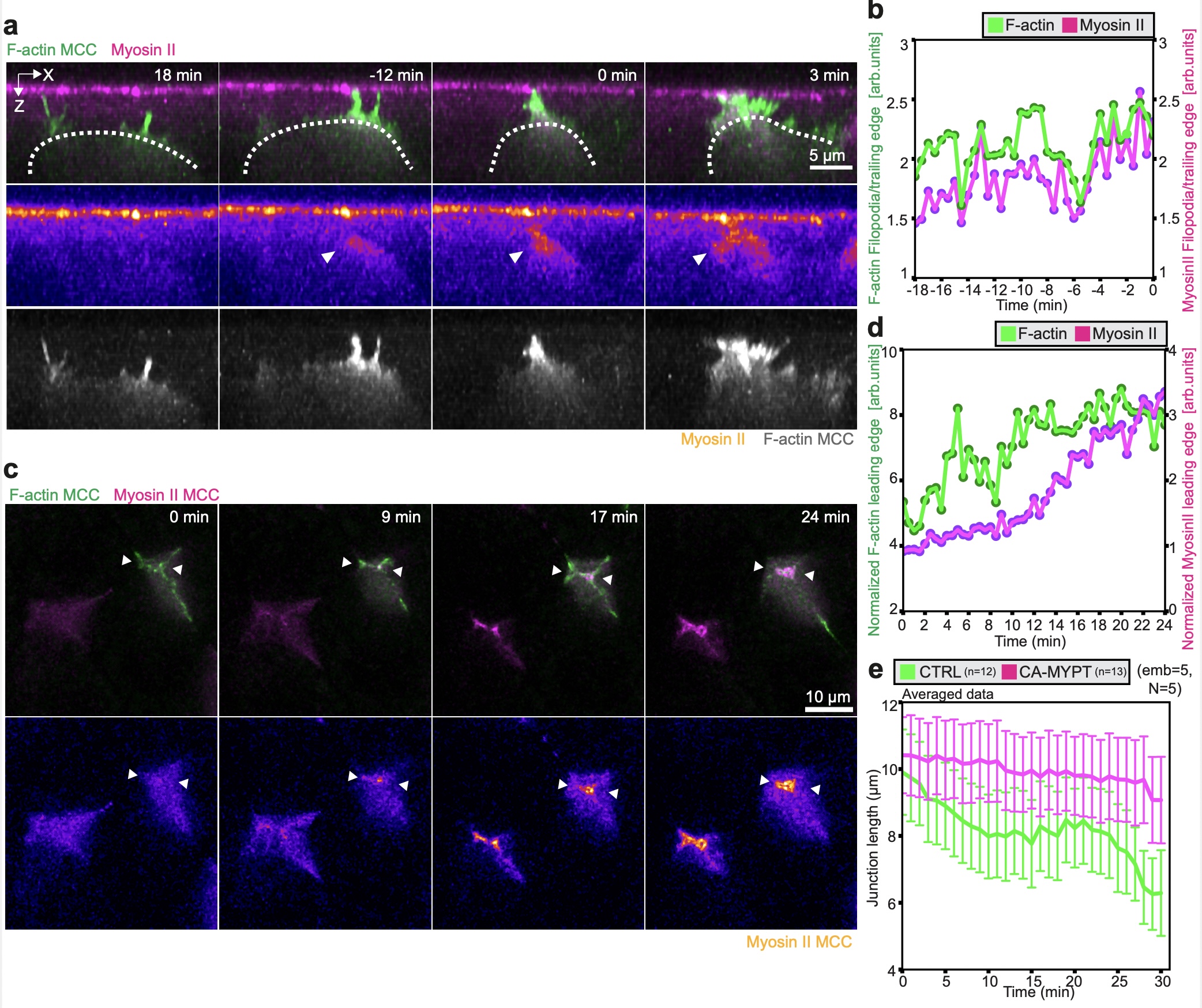 Supplementary Fig. 8 Myosin II is recruited to the leading edge of MCCs during probing and junction remodeling. a, Orthogonal (XZ) projections of myosin II recruitment to the MCC leading edge during integration. MCC is labeled with α-tubulin::LifeAct-RFP (pseudo colored green in a composite image, pseudo colored in gray as a single channel) and myosin II is labeled with myosin intrabody SF9-3xGFP (pseudo colored magenta in the composite image and pseudo colored in fire as a single channel). Scale bar: 5 μm. t=0 marks the last tracked frame during integration. b, Normalized myosin-II intensity (magenta) and normalized MCC F-actin intensity (green) at the leading edge of integrating MCC. (Also see Fig. 5b) c, Image sequence depicting myosin recruitment in MCC during junction remodeling. White arrowheads depict myosin accumulation. MCC is labeled with α-tubulin::LifeAct-RFP (pseudo colored green in a composite image, pseudo colored in gray as a single channel) and myosin II is labeled with myosin intrabody SF9-3xGFP (pseudo colored magenta in the composite image and pseudo colored in fire as a single channel). d, Normalized myosin II intensity (magenta) and normalized MCC F-actin intensity (green) at the leading edge of inserting MCC. e, Average junction length for control and CAMYPT-overexpressing MCCs after MCCs reached the overlying junctions, t=0 (nWT= 12 junctions, nCAMYPT = 13 junctions, N=5 experiments). Data show mean ± SEM. |