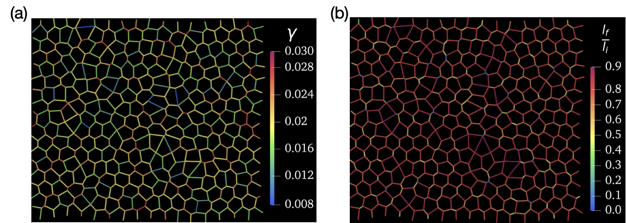 Supplementary Figure 9. Edge collapse due to line tension perturbations. (a) Initial configuration is defined as force-balanced tissue configuration with heterogeneous line tensions with average < >= 0.02. (b) The line tension of each edge i is perturbed to i+0.2< >. Then we find the new force balance configuration and by calculating the ratio of final edge length to initial length before perturbation lf /li, we find that bonds with higher line tension and shorter length are more likely to collapse (see Supplementary Note 1). |