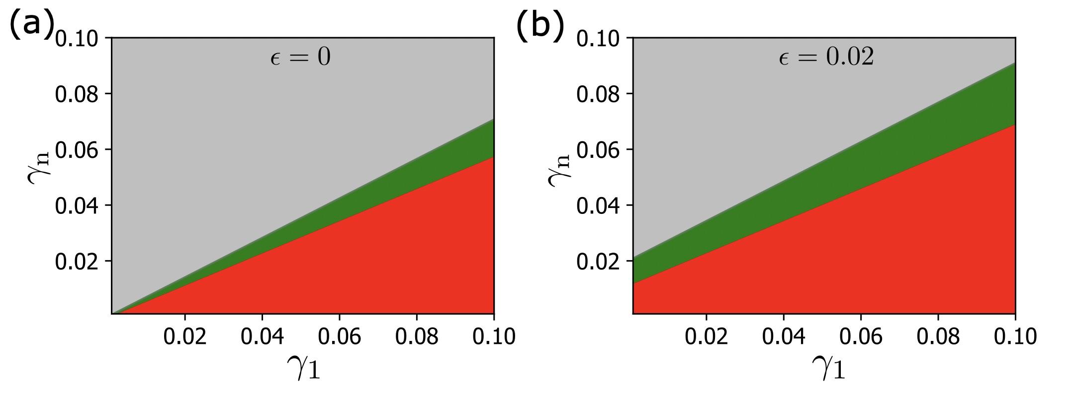 Supplementary Figure 13. Stability diagram for the intercalation at 3-fold and 4-fold vertices. Gray: neither three-fold nor four-fold allows a cell intercalation. Green: Only four-fold vertices allow cell intercalation. Red: Both three-fold and four-fold vertices allow for cell intercalation. The diagram is given for both Infinitesimal size (a) and finite size of inserting cells (b). (see Supplementary Note 1) |
