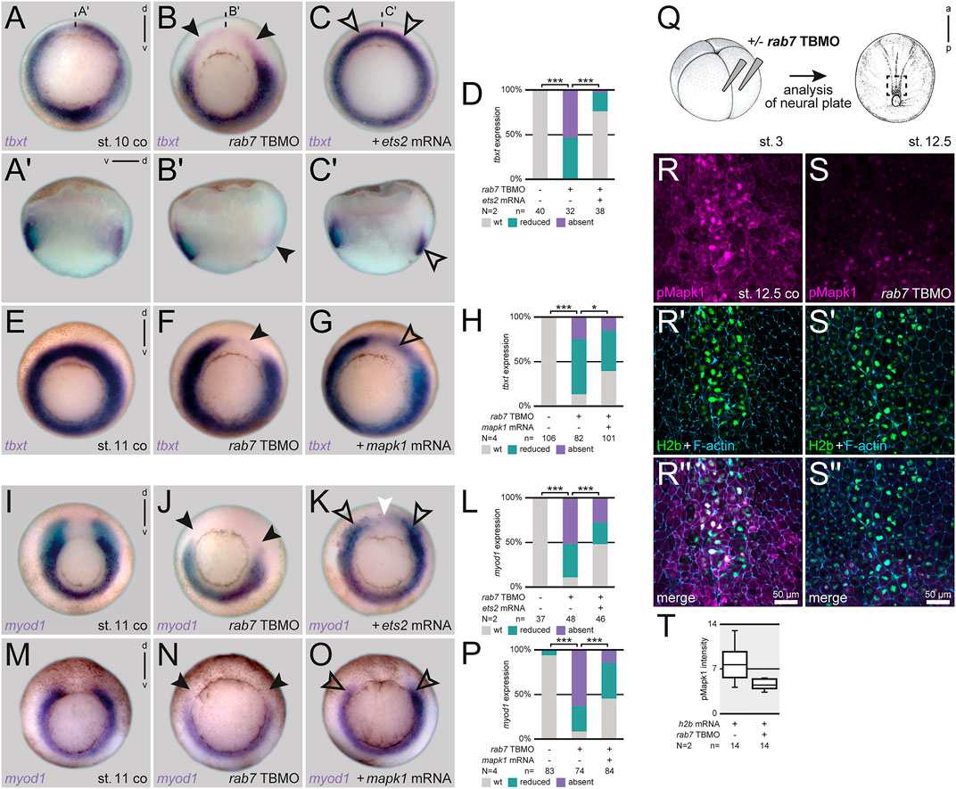 FIGURE 3. Loss of Rab7 blocks dorsal mesoderm specification upstream of Mapk activation. (A) Uniform circular appearance of tbxt expression of st. 10 Xenopus embryos (B) faded due to dorsal knockdown of rab7 (black arrowheads). (C) Rescue injection of ets2 mRNA restored expression almost back to wild type level (outlined black arrowheads). (A′–C′) Panels beneath depict corresponding sagittal sections. (D) Quantification of tbxt expression rescued by ets2 mRNA. (E) Circular tbxt expression of st. 11 specimen (F) faded upon unilateral dorsal rab7 LOF (black arrowhead). (G) Coinjection of mapk1D324N mRNA in morphant embryos partially restored lost dorsal tbxt expression (black outlined arrowhead). (H) Quantification of tbxt expression rescued by mapk1D324N mRNA. (I) myod1 horseshoe-shaped expression of st. 11 specimen (J) displayed downregulated paraxial transcripts after dorsal loss of rab7 (black arrowheads). (K) ets2 mRNA injected dorsally rescued the paraxial mesoderm identity (outlined black arrowheads); please note ectopic expression found in animal areas above the dorsal gap (white arrowhead). (L) Quantification of myod1 expression rescued by ets2 mRNA. (M) Horseshoe myod1 expression of st. 11 specimen (N) faded upon dorsal rab7 LOF (black arrowheads). (O) Coinjection of mapk1D324N mRNA in morphant embryos partially restored lost dorsal myod1 expression (black outlined arrowheads). (P) Quantification of myod1 expression rescued by mapk1D324N mRNA. (Q) Injection scheme and localization of imaged animal tissue of st. 12.5 embryos (R,R′′) Nucleic and cytosolic accumulation of pMapk1 (magenta) at posterior neural plate of wild type specimen. (S,S′′) Downregulation of pMapk1 signal intensity in rab7-morphant neural plates. (R′,S′) For lineage tracing and nuclear staining of h2b mRNA (green) was used, cell borders are highlighted by F-actin (blue). (T) Intensity quantification of pMapk1 signal in panels (R,S). All rab7 TBMO injections in this figure were done with high dose approach. a, anterior; co, control; d, dorsal; N, number of experiments; n, number of evaluated embryos; p, posterior; pmol, picomole; st., stage; TBMO, translation blocking Morpholino oligomere; v, ventral; wt, wild type; µm, micrometer. |