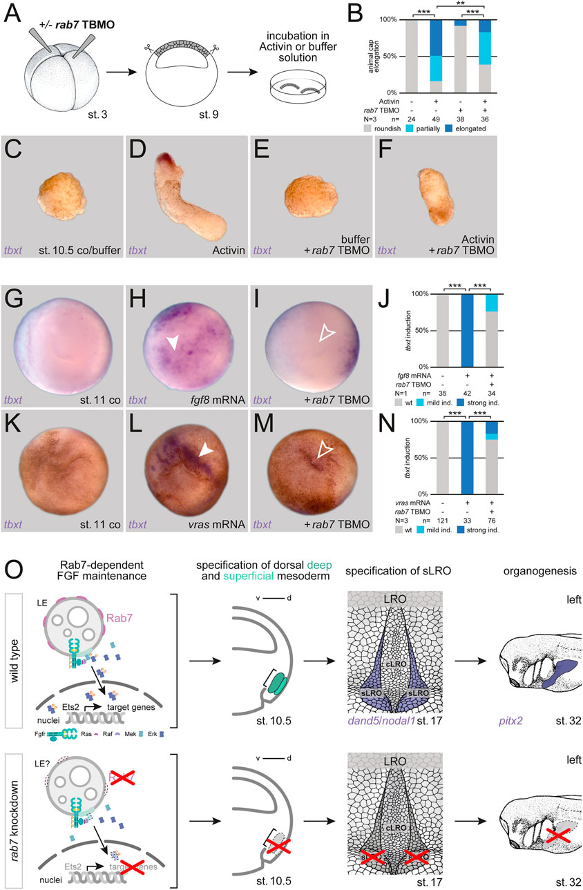 FIGURE 4. Rab7 is required for FGF-dependent mesoderm induction. (A) Experimental setup for the shown animal cap elongation assay: Injection at four-cell stage (left) targeted the animal hemisphere, at st. 9 animal caps were dissected (middle) and incubated in Activin A or buffer solution (right). (B) Quantification of animal cap elongation. (C) Untreated animal caps (D) elongated upon Activin treatment. (E) rab7-deficient, untreated animal caps remained in a roundish shape, (F) treated ones depicted partial or complete inhibition of elongation. (D) tbxt expression was only observed in Activin treated, elongated caps. (G,K) Wild type animal caps of st. 11 embryos. (H) Induction of tbxt expression (white arrowheads) in animal caps by fgf8 or (L) vras mRNA overexpression. (I,M) Loss of rab7 in those animal caps blocked tbxt induction (outlined arrowheads). (J,N) Quantification of tbxt induction via fgf8 or vras mRNA. All rab7 TBMO injections in this figure were done with high dose approach. (O) Proposed model for Rab7-dependent dorsal mesoderm and subsequent sLRO specification triggering LR development: (Top) Rab7-positive LEs could provide the platform for sustained FGF signal transduction (left). FGF signals mediate deep and superficial mesoderm specification (middle-left). Mesoderm development enables LRO morphogenesis (middle-right), the crucial tissue for LR asymmetry (right). (Bottom) Loss of Rab7 would inhibit FGF signal maintenance due to lost signaling platforms (left), causing a lack of deep and superficial mesoderm specification (middle-left). Loss of mesoderm prevents sLRO formation (middle-right) blocking LR axis establishment (right). cLRO, central LRO; co, control; d, dorsal; ind., induction; LRO, left-right organizer; N, number of experiments; n, number of evaluated embryos; sLRO, somitic LRO; st., stage; TBMO, translation blocking Morpholino oligomere; v, ventral; wt, wild type. |