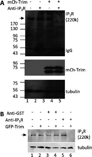 FIGURE 1:. TrimAway IP3R in Xenopus oocytes. (A) Control oocytes and oocytes injected with mCherry-Trim21 mRNA were incubated for 24 h followed by injection with anti-IP3R antibodies, as indicated. Oocytes were lysed 4 h after antibody injection for immunoblotting, first using anti-IP3R antibodies followed by and anti-β-tubulin antibodies. Molecular weight markers are shown. Arrow depicts IP3R. Representative of three independent experiments. (B) Control oocytes and oocytes injected with eGFP-Trim21 mRNA were incubated for 24 h followed by injection with anti-IP3R antibodies or anti-GST antibodies, as indicated. Four hours following antibody injection, oocytes were lysed for immunoblotting using anti-IP3R antibodies or anti-tubulin antibodies. Arrow depicts IP3R. Representative of three independent experiments.