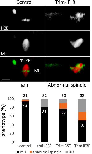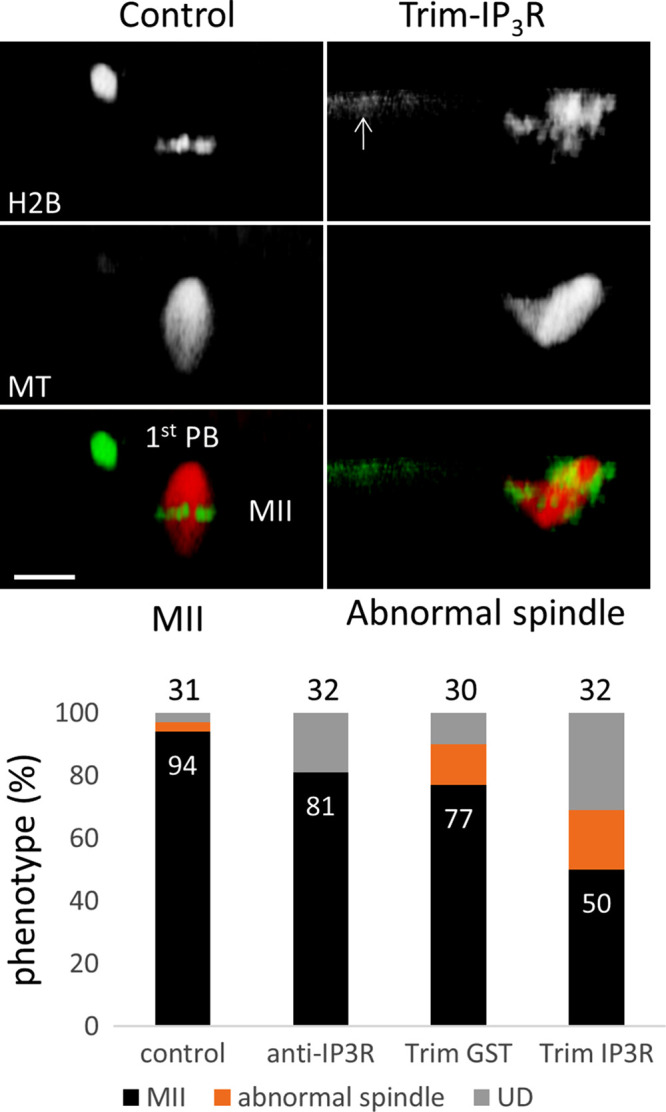 FIGURE 2: IP3R depletion inhibited first polar body formation. Oocytes injected with mRNAs coding for RFP-tubulin (red) and eGFP-H2B (green) were further injected with GFP-Trim21 mRNA as indicated (Trim). Twenty-four (24) hours after Trim21 mRNA injection, oocytes were injected with anti-IP3R antibodies or anti-GTS antibodies as indicated. Four hours after antibody injection, all oocytes were incubated with progesterone overnight before being examined by confocal microscopy. Oocytes were recorded as metaphase II (MII, with a first polar body and a bipolar metaphase II spindle; scale bar = 20 µm), abnormal spindle (no polar body; arrow depicts oocyte cortex), or undetectable (UD) (no chromosomes seen within the depth of the confocal system, not shown). The graph summaries five independent experiments depicting the proportions of oocytes exhibiting the three phenotypes. Percentage of MII oocytes in each group is indicated within the bar, with total oocyte number indicated above.