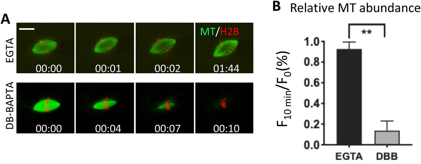 FIGURE 5: DB-BAPTA, but not EGTA, disrupt bipolar spindles in cell-free extracts. (A) Images of hh:mm. Scale bar = 20 µm. (B) The bar plot summarizes the relative microtubule abundance at 10 min after injection. Means ± SD; ** indicates p < 0.01; n = 4 (EGTA), n = 8 (DB-BAPTA).
