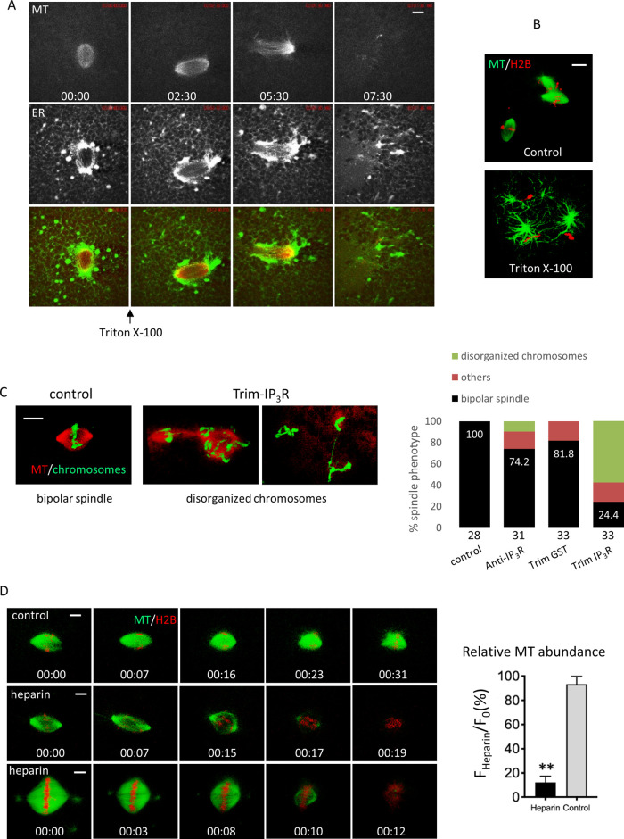 FIGURE 4:. Bipolar spindle formation in extracts required ER membranes and IP3R. (A) Simultaneous disruption of reticular ER structure and bipolar spindles: Triton X-100 was added to a cytoplasmic droplet containing bipolar spindles (00:00) at a final concentration of 0.1%. Confocal time-lapse imaging (3D projections of the entire confocal stacks) was carried out following the behavior of the same spindle (n = 5). Scale bar = 20 µm. Shown is a representative series obtained in four independent experiments. (B) Cell-free cytoplasmic extract spindle assembly in the absence (control) or presence of 0.1% Triton X-100. Scale bar = 20 µm. Shown are representations of 6 independent experiments. (C) Oocytes injected with mRNAs coding for RFP-tubulin and eGFP-H2B were further injected with Trim21 mRNA as indicated (Trim). At 24 h after Trim21 mRNA injection, oocytes were injected with anti-IP3R antibodies or anti-GST antibodies as indicated. At 4 h after antibody injection, all oocytes were incubated with progesterone overnight. The oocytes were then subjected to cytoplasm aspiration and spindle assembly assays. The ability of each oocyte to assemble bipolar spindles was assessed by confocal imaging and classified as bipolar spindle, disorganized chromosomes, or others (nuclei or microtubule asters). Shown are typical images of bipolar spindles and disorganized chromosomes, and a summary of four independent experiments with the total number of oocytes (n) in each group indicated. Scale bar = 20 µm. (D) Time-lapse (hh:mm) imaging of cell-free extract spindles following infusion of calcium-free OR2 (vehicle control) or heparin (200 µg/ml, two examples). Scale bar = 20 µm. The bar graph summarizes spindle microtubule abundance 7.5–20 min after heparin infusion relative to that before heparin infusion. For control, microtubule abundance 20 min after calcium-free OR2 infusion was compared with that before calcium-free OR2 infusion. Means ± SD; ** indicates p < 0.01; n = 10.